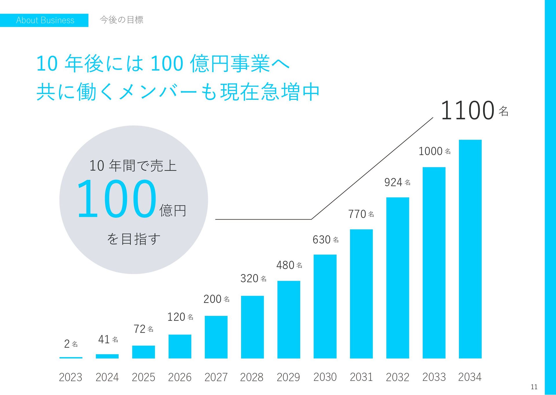 10 年後には 100 億円事業へ 共に働くメンバーも現在急増中 About Business 今後の目標 1100名 2名