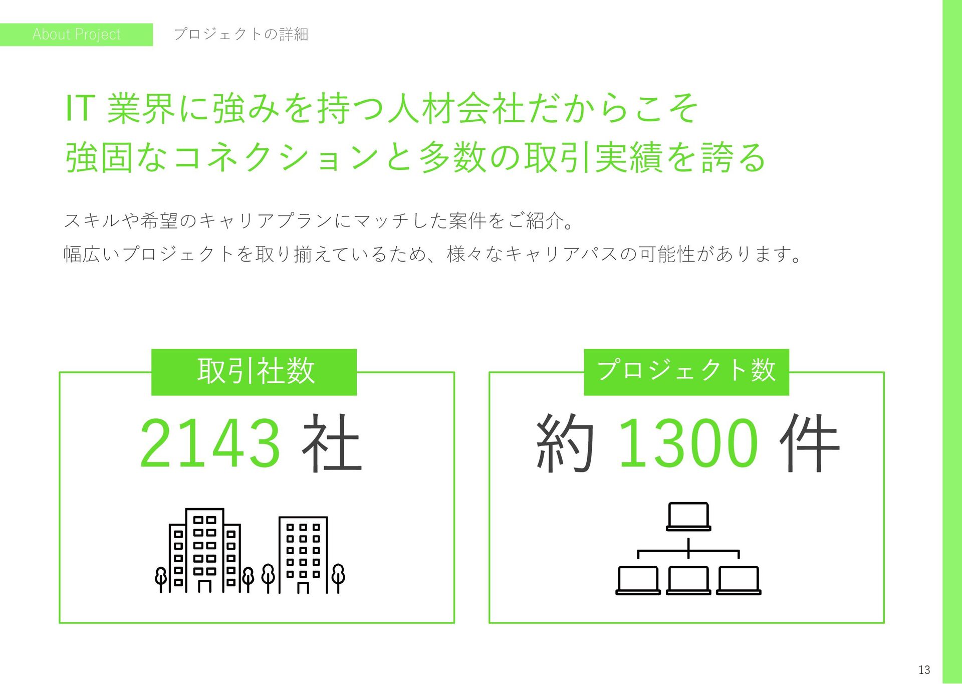 IT 業界に強みを持つ人材会社だからこそ 強固なコネクションと多数の取引実績を誇る スキルや希望のキャリアプランにマッチした案件をご紹介。 幅広いプロジェクトを取り揃えているため、様々なキャリアパスの可能性があります。 About Project プロジェクトの詳細 取引社数 プロジェクト数