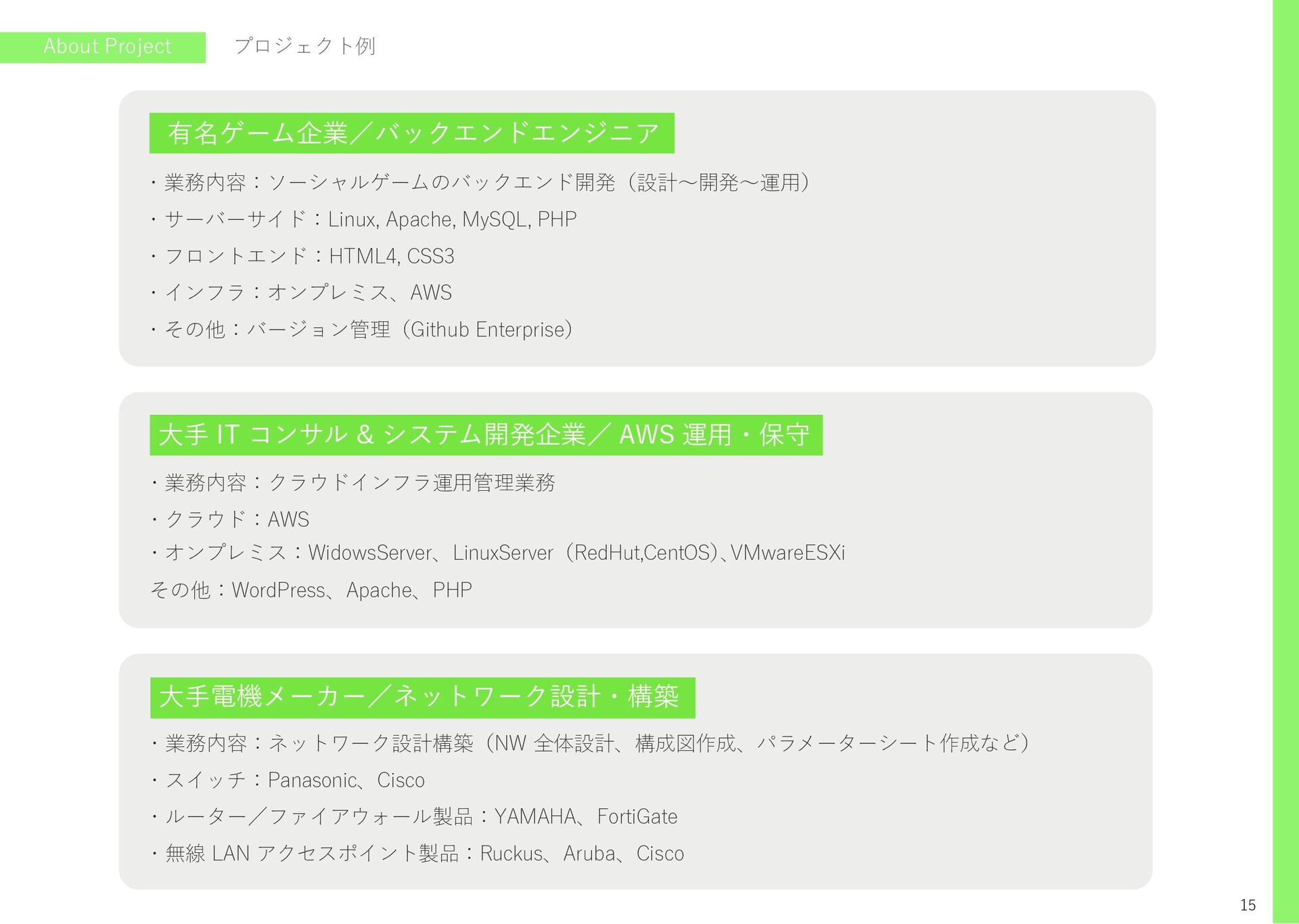 ・インフラ:オンプレミス、AWS ・その他:バージョン管理(Github Enterprise) ・業務内容:クラウドインフラ運用管理業務 ・クラウド:AWS ・オンプレミス:WidowsServer、LinuxServer(RedHut,CentOS) 、 VMwareESXi その他:WordPress、Apache、PHP ・業務内容:ネットワーク設計構築(NW 全体設計、構成図作成、パラメーターシート作成など) ・スイッチ:Panasonic、Cisco ・ルーター/ファイアウォール製品:YAMAHA、FortiGate ・無線 LAN アクセスポイント製品:Ruckus、Aruba、Cisco 有名ゲーム企業/バックエンドエンジニア 大手電機メーカー/ネットワーク設計・構築 大手 IT コンサル & システム開発企業/ AWS 運用・保守 15