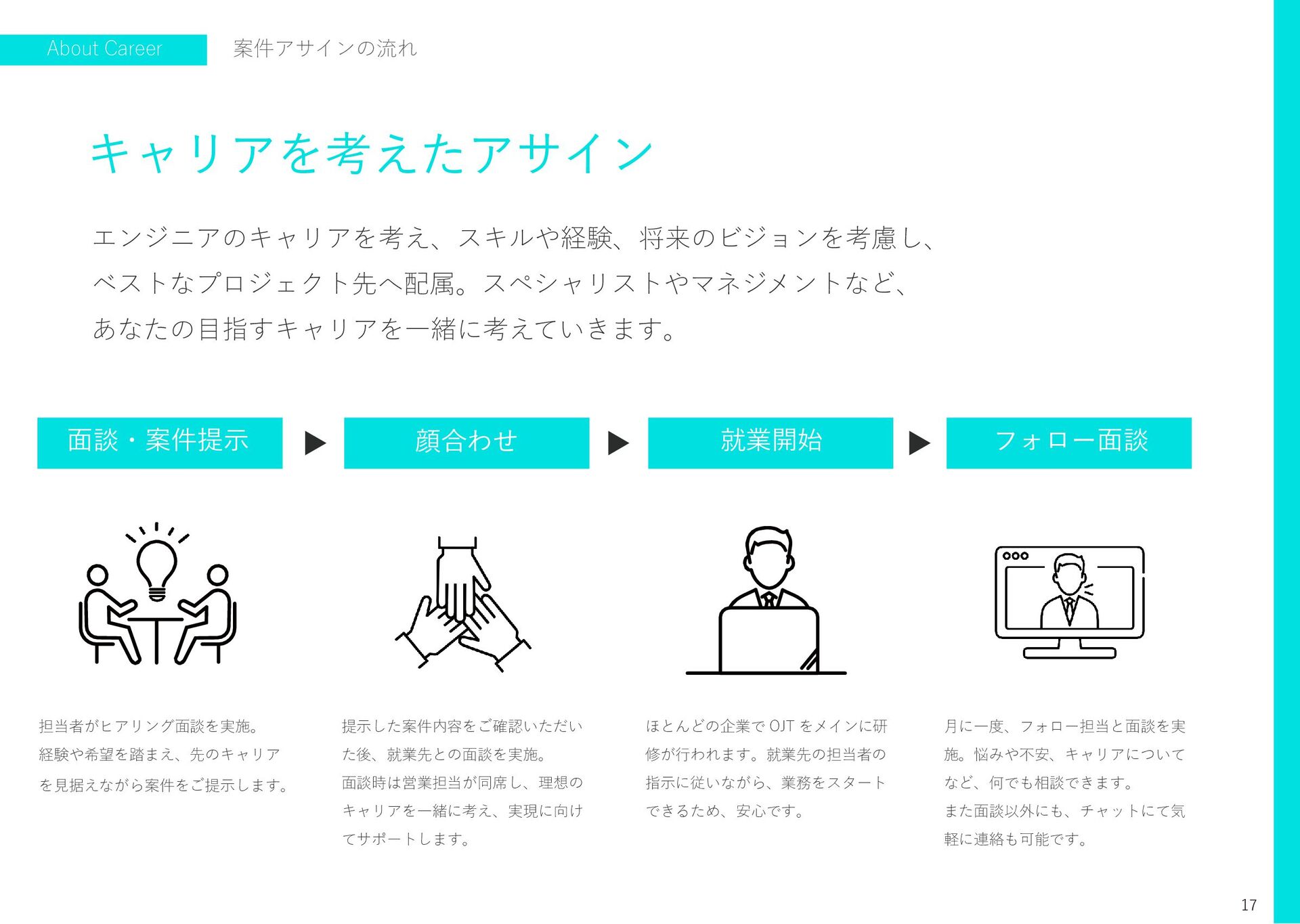キャリアを考えたアサイン About Career 案件アサインの流れ エンジニアのキャリアを考え、スキルや経験、将来のビジョンを考慮し、 ベストなプロジェクト先へ配属。スペシャリストやマネジメントなど、 あなたの目指すキャリアを一緒に考えていきます。 担当者がヒアリング面談を実施。 経験や希望を踏まえ、先のキャリア を見据えながら案件をご提示します。
