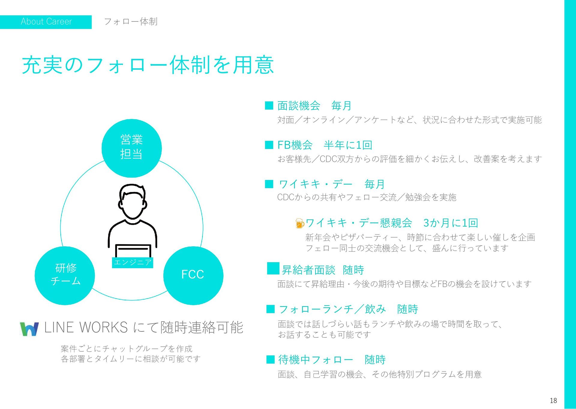 お客様先/CDC双方からの評価を細かくお伝えし、改善案を考えます ▪ ワイキキ・デー 毎月 CDCからの共有やフェロー交流/勉強会を実施 ワイキキ・デー懇親会 3か月に1回 新年会やピザパーティー、時節に合わせて楽しい催しを企画 フェロー同士の交流機会として、盛んに行っています ▪昇給者面談 随時 面談にて昇給理由・今後の期待や目標などFBの機会を設けています ▪ フォローランチ/飲み 随時 面談では話しづらい話もランチや飲みの場で時間を取って、 お話することも可能です ▪ 待機中フォロー 随時 面談、自己学習の機会、その他特別プログラムを用意 エンジニア 営業 担当 FCC 研修 チーム LINE WORKS にて随時連絡可能 案件ごとにチャットグループを作成 各部署とタイムリーに相談が可能です 充実のフォロー体制を用意 18