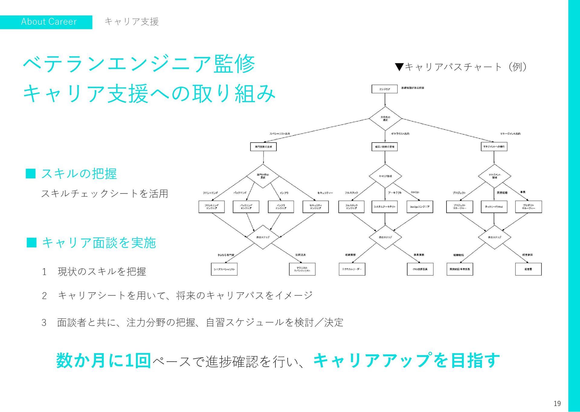 2 キャリアシートを用いて、将来のキャリアパスをイメージ 3 面談者と共に、注力分野の把握、自習スケジュールを検討/決定 ▼キャリアパスチャート(例) 数か月に1回ペースで進捗確認を行い、キャリアアップを目指す ベテランエンジニア監修 キャリア支援への取り組み 19