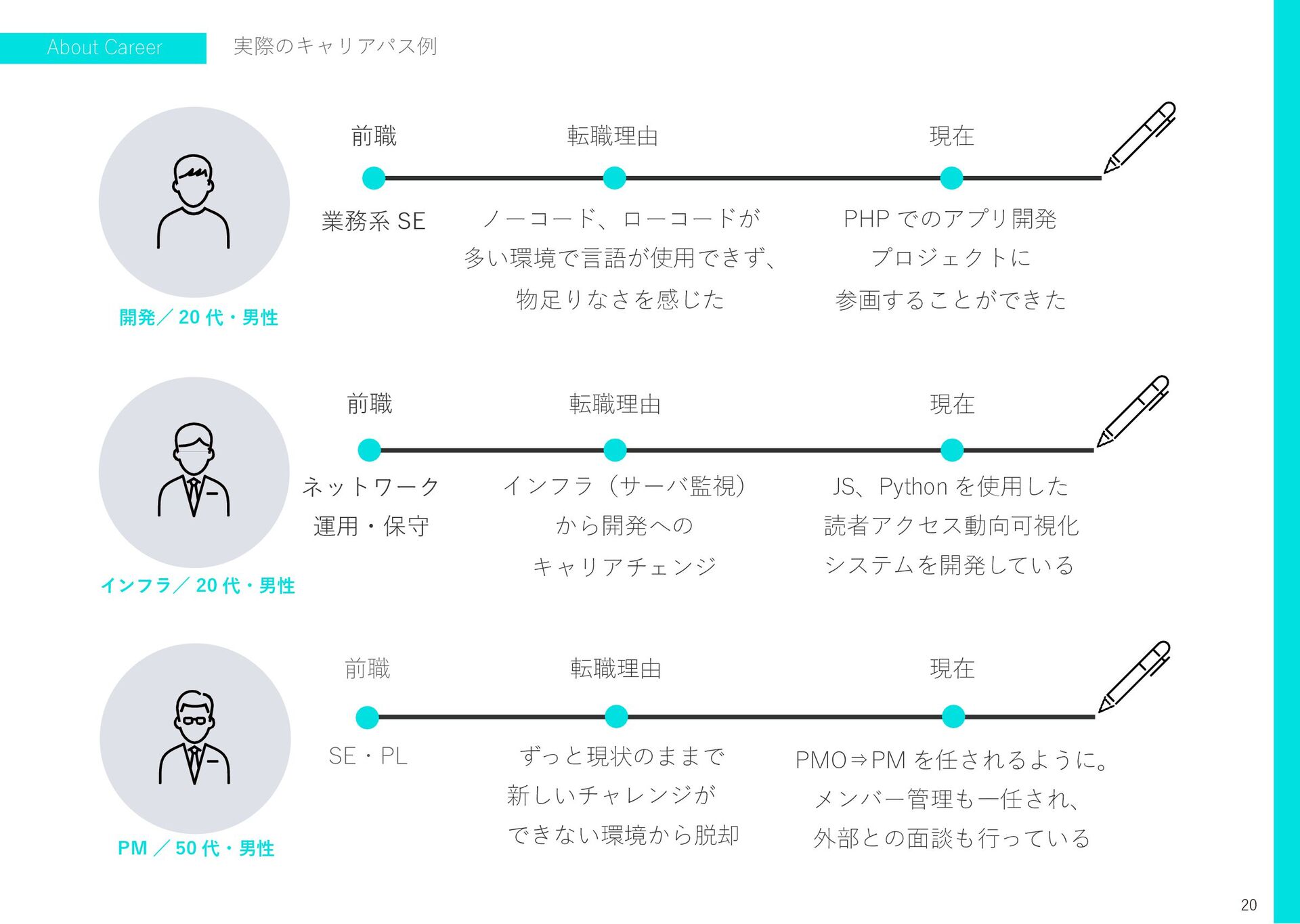 ずっと現状のままで 新しいチャレンジが できない環境から脱却 インフラ(サーバ監視) から開発への キャリアチェンジ ノーコード、ローコードが 多い環境で言語が使用できず、 物足りなさを感じた SE・PL PM / 50 代・男性 インフラ/ 20 代・男性 開発/ 20 代・男性 PMO⇒PM を任されるように。 メンバー管理も一任され、 外部との面談も行っている JS、Python を使用した 読者アクセス動向可視化 システムを開発している PHP でのアプリ開発 プロジェクトに 参画することができた 前職 前職 ネットワーク 運用・保守 業務系 SE 20