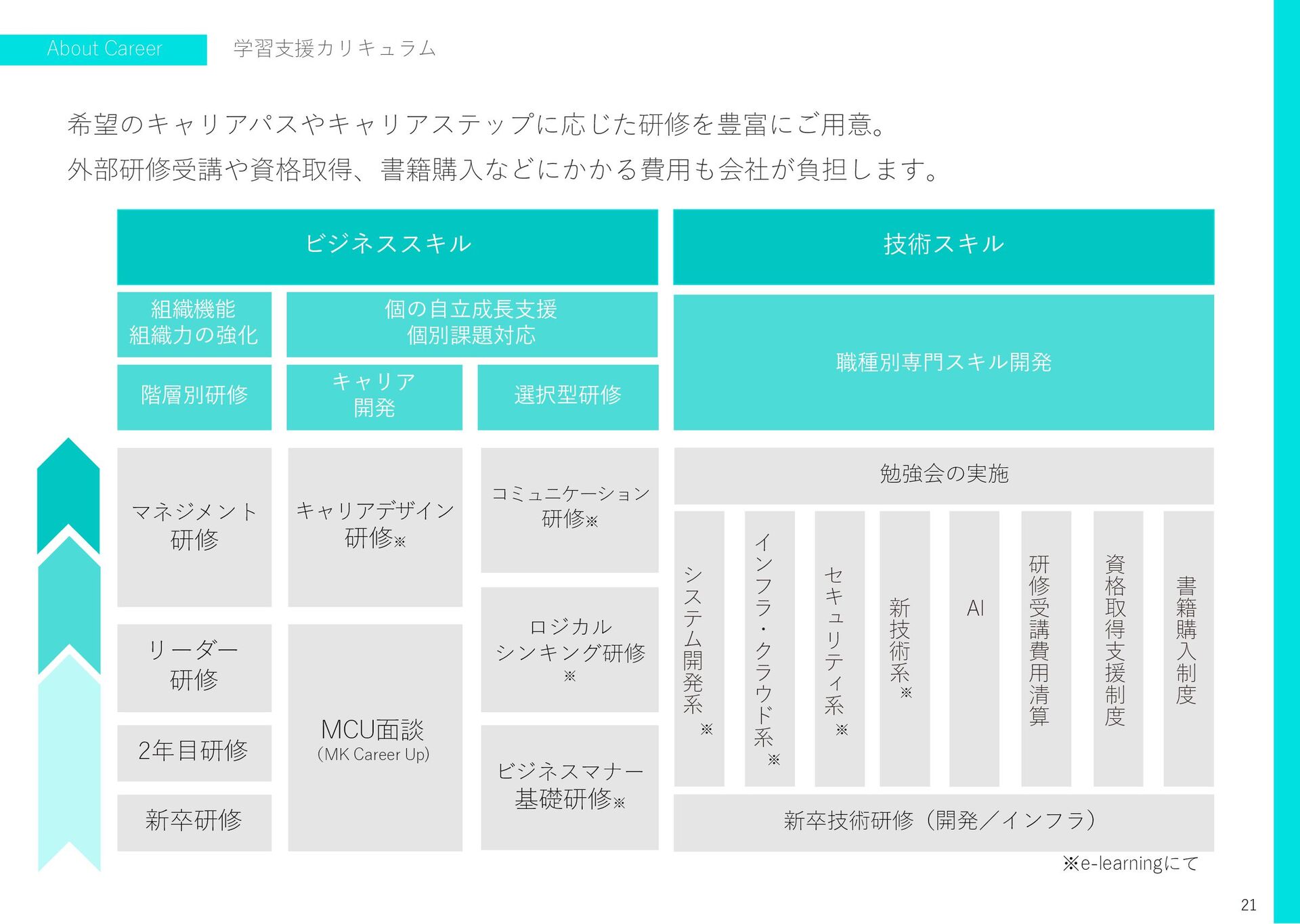 個の自立成長支援 個別課題対応 キャリア 開発 選択型研修 職種別専門スキル開発 新卒研修 2年目研修 リーダー 研修 マネジメント 研修 MCU面談 (MK Career Up) キャリアデザイン 研修※ ビジネスマナー 基礎研修※ ロジカル シンキング研修 ※ コミュニケーション 研修※ 新卒技術研修(開発/インフラ) 勉強会の実施 ※ ※ ※ ※ ※ ※e-learningにて シ ス テ ム 開 発 系 イ ン フ ラ ・ ク ラ ウ ド 系 セ キ ュ リ テ ィ 系 新 技 術 系 生 成 ビ ジ ネ ス 系 研 修 受 講 費 用 清 算 資 格 取 得 支 援 制 度 書 籍 購 入 制 度 AI 21