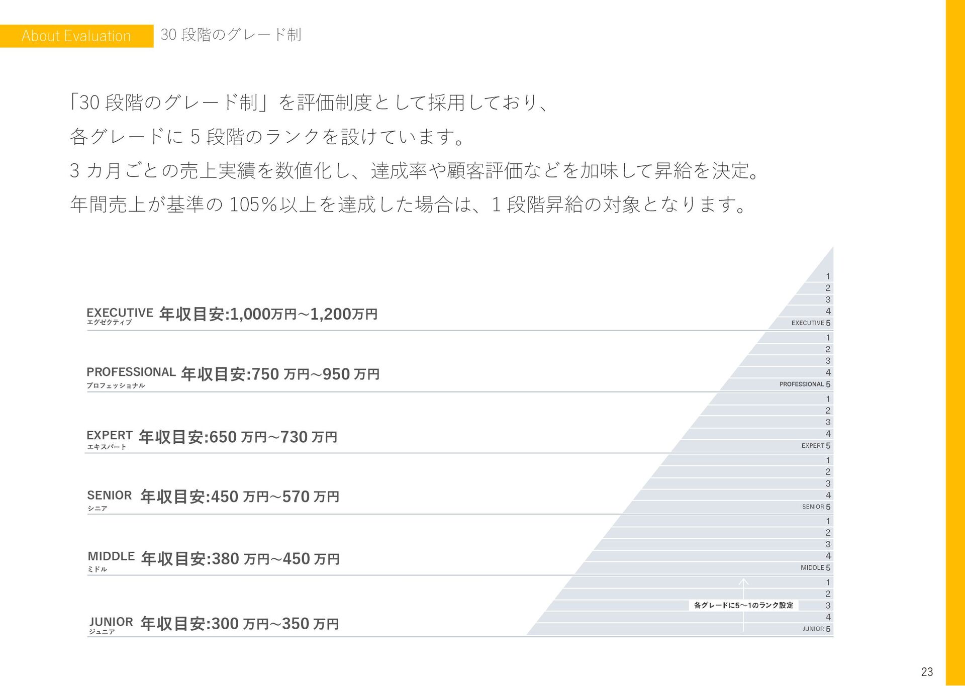 カ月ごとの売上実績を数値化し、達成率や顧客評価などを加味して昇給を決定。 年間売上が基準の 105%以上を達成した場合は、1 段階昇給の対象となります。 EXECUTIVE 年収目安:1,000万円~1,200万円 23 エグゼクティブ プロフェッショナル PROFESSIONAL 年収目安:750 万円~950 万円 エキスパート SENIOR シニア ミドル ジュニア EXPERT 年収目安:650 万円~730 万円 MIDDLE 年収目安:380 万円~450 万円 JUNIOR 年収目安:300 万円~350 万円 年収目安:450 万円~570 万円