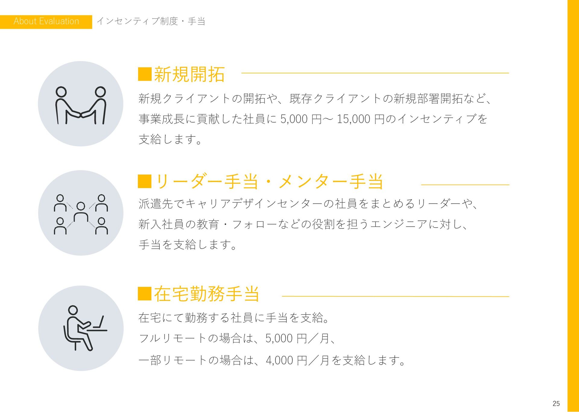 ▪新規開拓 ▪リーダー手当・メンター手当 派遣先でキャリアデザインセンターの社員をまとめるリーダーや、 新入社員の教育・フォローなどの役割を担うエンジニアに対し、 手当を支給します。 ▪在宅勤務手当 在宅にて勤務する社員に手当を支給。 フルリモートの場合は、5,000 円/月、 一部リモートの場合は、4,000 円/月を支給します。 25