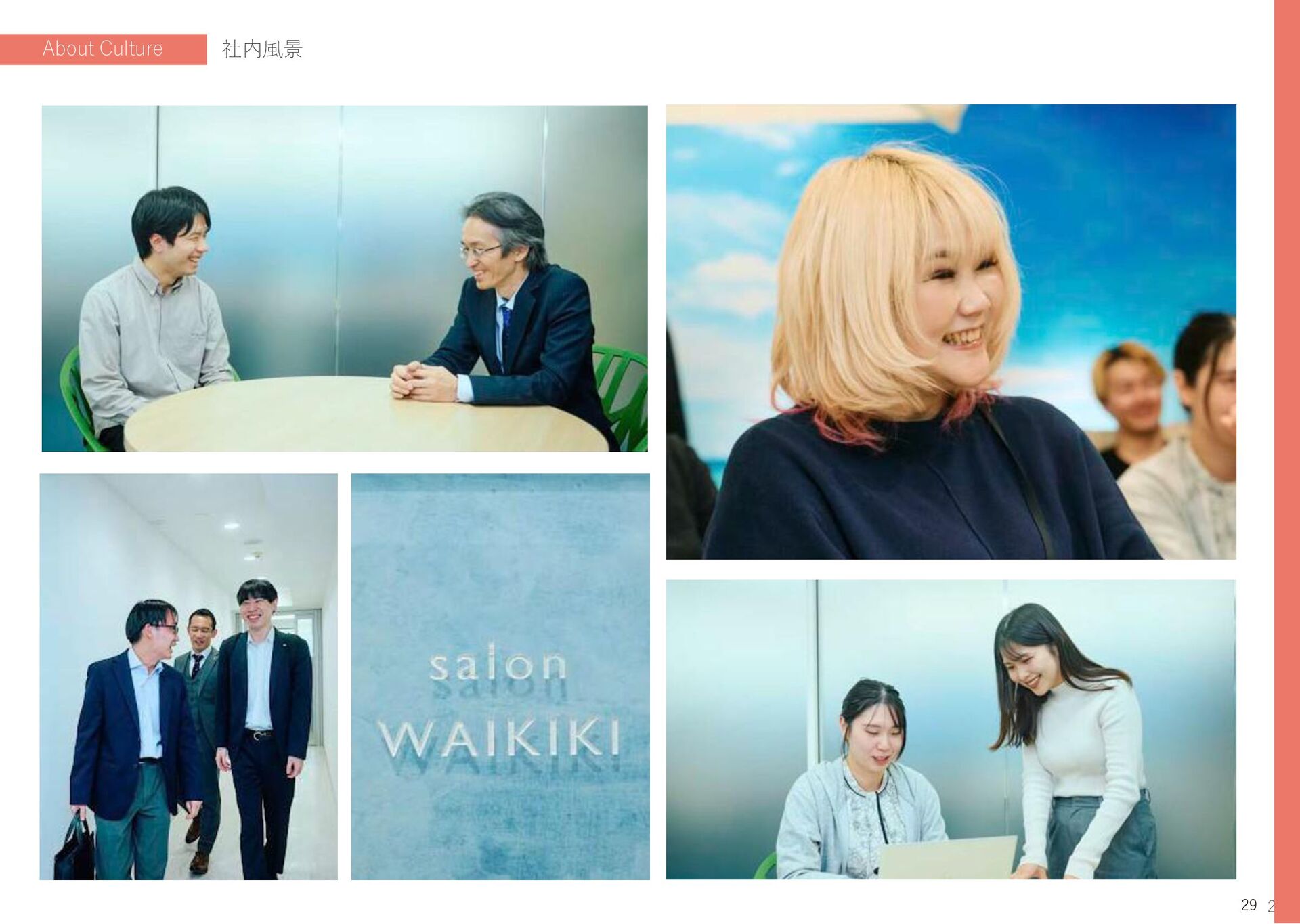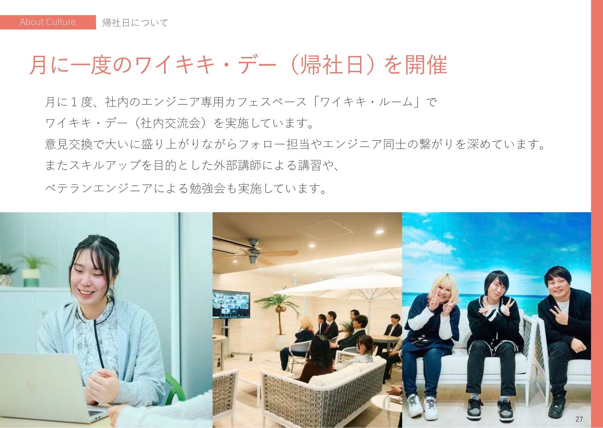About Culture 帰社日について 月に 1 度、社内のエンジニア専用カフェスペース「ワイキキ・ルーム」で ワイキキ・デー(社内交流会)を実施しています。 意見交換で大いに盛り上がりながらフォロー担当やエンジニア同士の繋がりを深めています。 またスキルアップを目的とした外部講師による講習や、 ベテランエンジニアによる勉強会も実施しています。