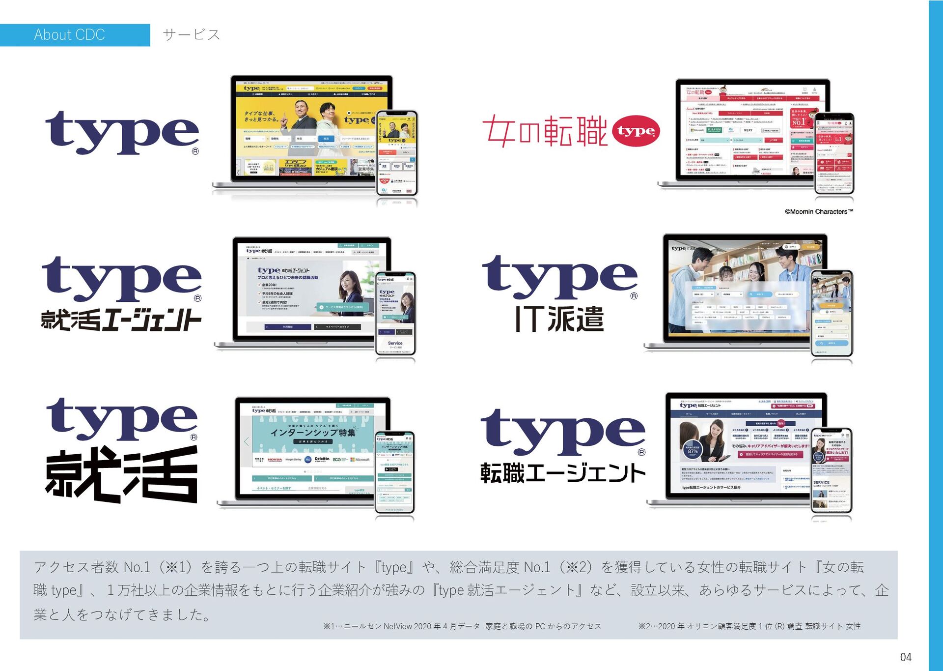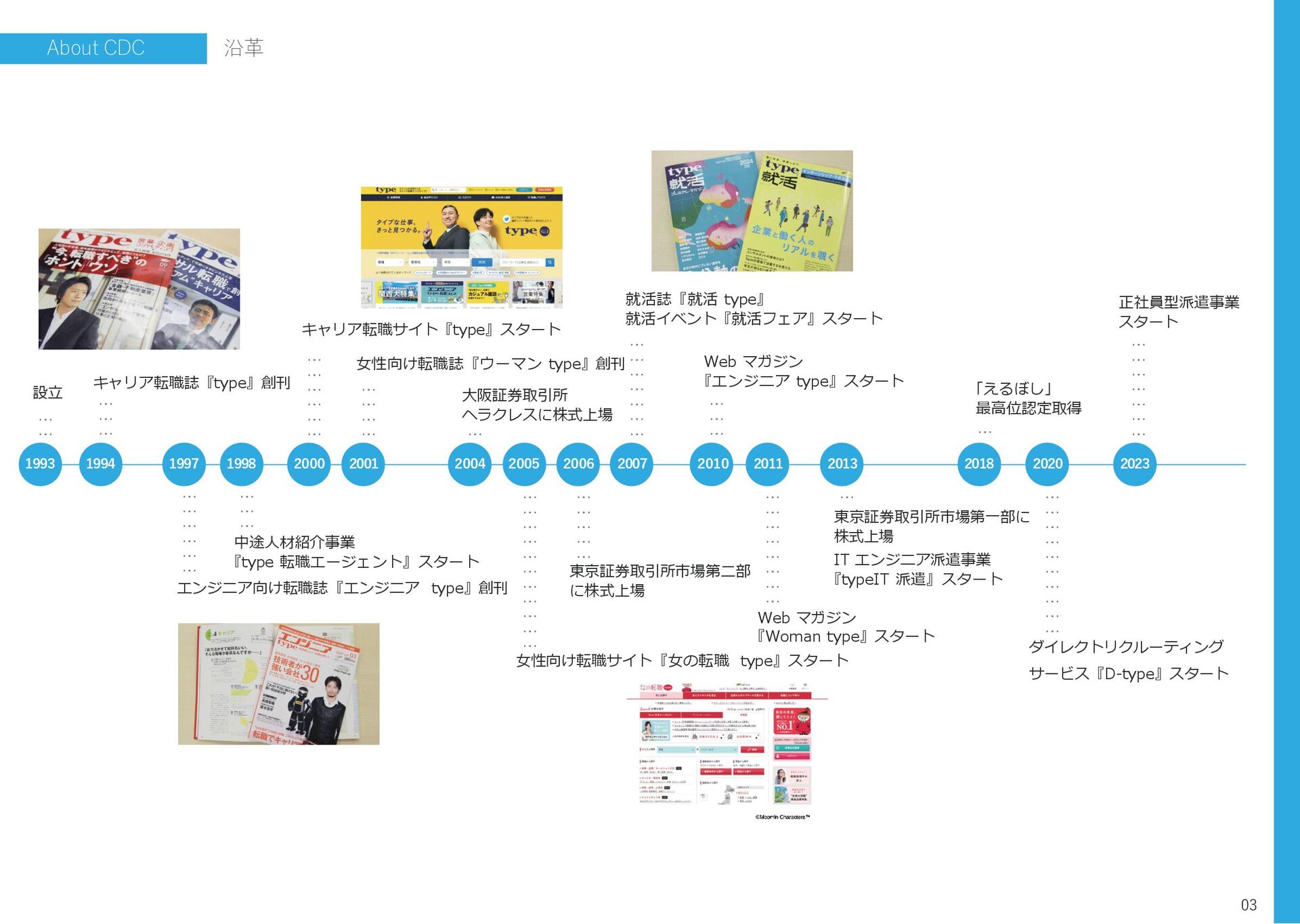 ︙ 2004 2005 2006 2007 ︙︙︙︙︙︙︙ ︙︙︙︙︙︙︙ ︙︙︙ ︙︙︙︙︙︙︙︙︙︙︙ ︙︙︙︙︙ 1997 ︙︙︙︙︙︙ 1998 ︙︙︙ 設立 キャリア転職誌『type』創刊 キャリア転職サイト『type』スタート 女性向け転職誌『ウーマン type』創刊 大阪証券取引所 ヘラクレスに株式上場 就活誌『就活 type』 就活イベント『就活フェア』スタート 正社員型派遣事業 スタート Web マガジン 『エンジニア type』スタート 「えるぼし」 最高位認定取得 2010 2011 ︙︙︙︙︙︙︙︙ Web マガジン 『Woman type』スタート 女性向け転職サイト『女の転職 type』スタート 東京証券取引所市場第一部に 株式上場 IT エンジニア派遣事業 『typeIT 派遣』スタート ダイレクトリクルーティング サービス『D-type』スタート 東京証券取引所市場第二部 に株式上場 中途人材紹介事業 『type 転職エージェント』スタート エンジニア向け転職誌『エンジニア type』創刊 ︙ 2013 ︙ 2018 2020 2023 About CDC 03