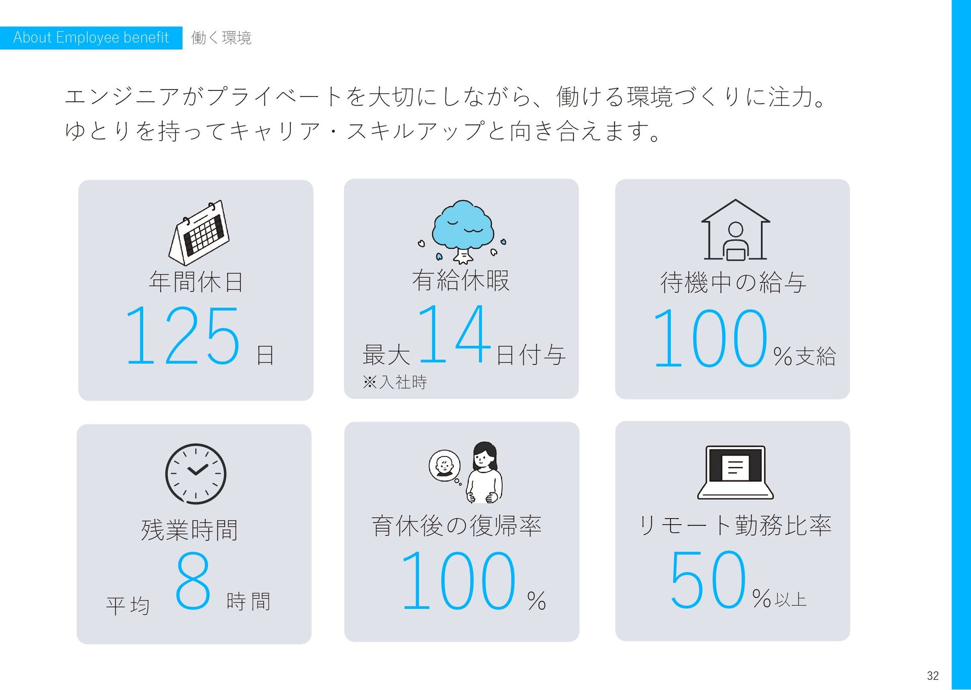 ※入社時 待機中の給与 100 %支給 残業時間 育休後の復帰率 8 時 間 100 % リモート勤務比率 50 %以上 平 均 About Employee benefit 32