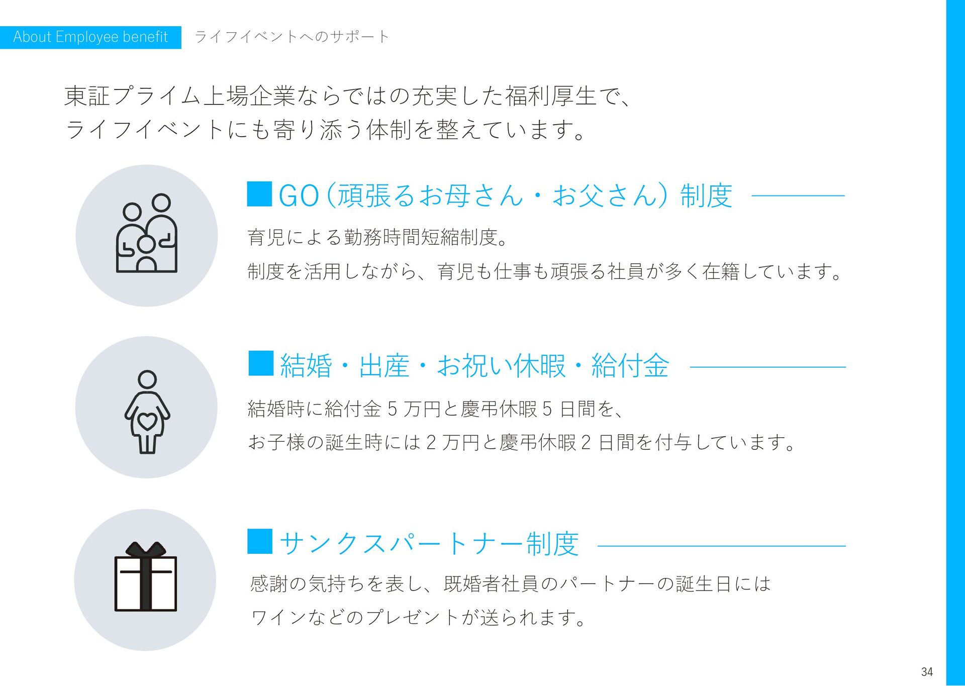 5 万円と慶弔休暇 5 日間を、 お子様の誕生時には 2 万円と慶弔休暇 2 日間を付与しています。 ▪サンクスパートナー制度 感謝の気持ちを表し、既婚者社員のパートナーの誕生日には ワインなどのプレゼントが送られます。 34 About Employee benefit