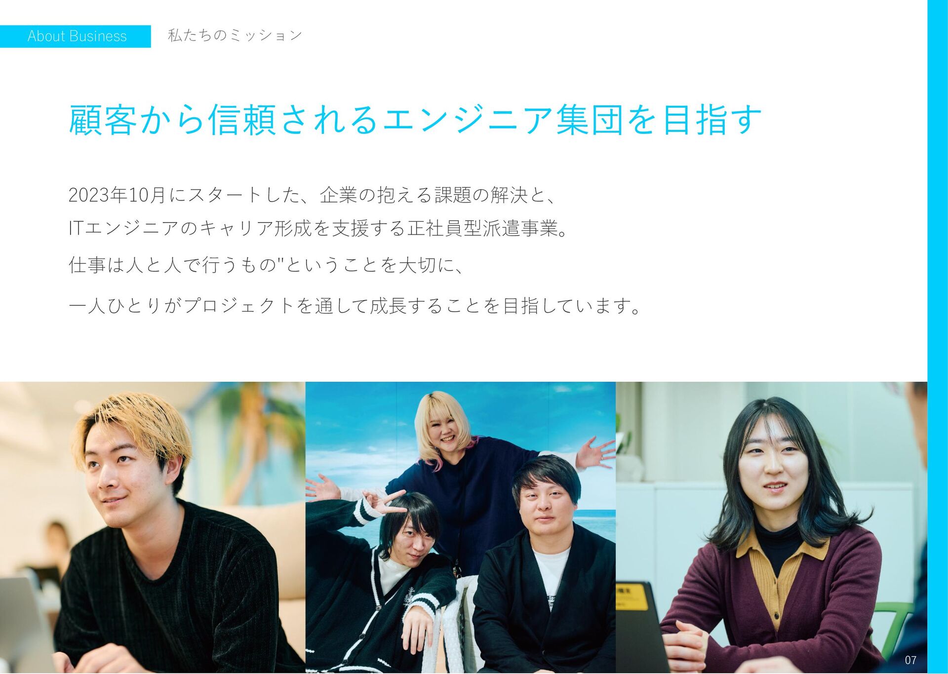 About Business 私たちのミッション 顧客から信頼されるエンジニア集団を目指す 2023年10月にスタートした、企業の抱える課題の解決と、 ITエンジニアのキャリア形成を支援する正社員型派遣事業。 仕事は人と人で行うもの"ということを大切に、 一人ひとりがプロジェクトを通して成長することを目指しています。 07