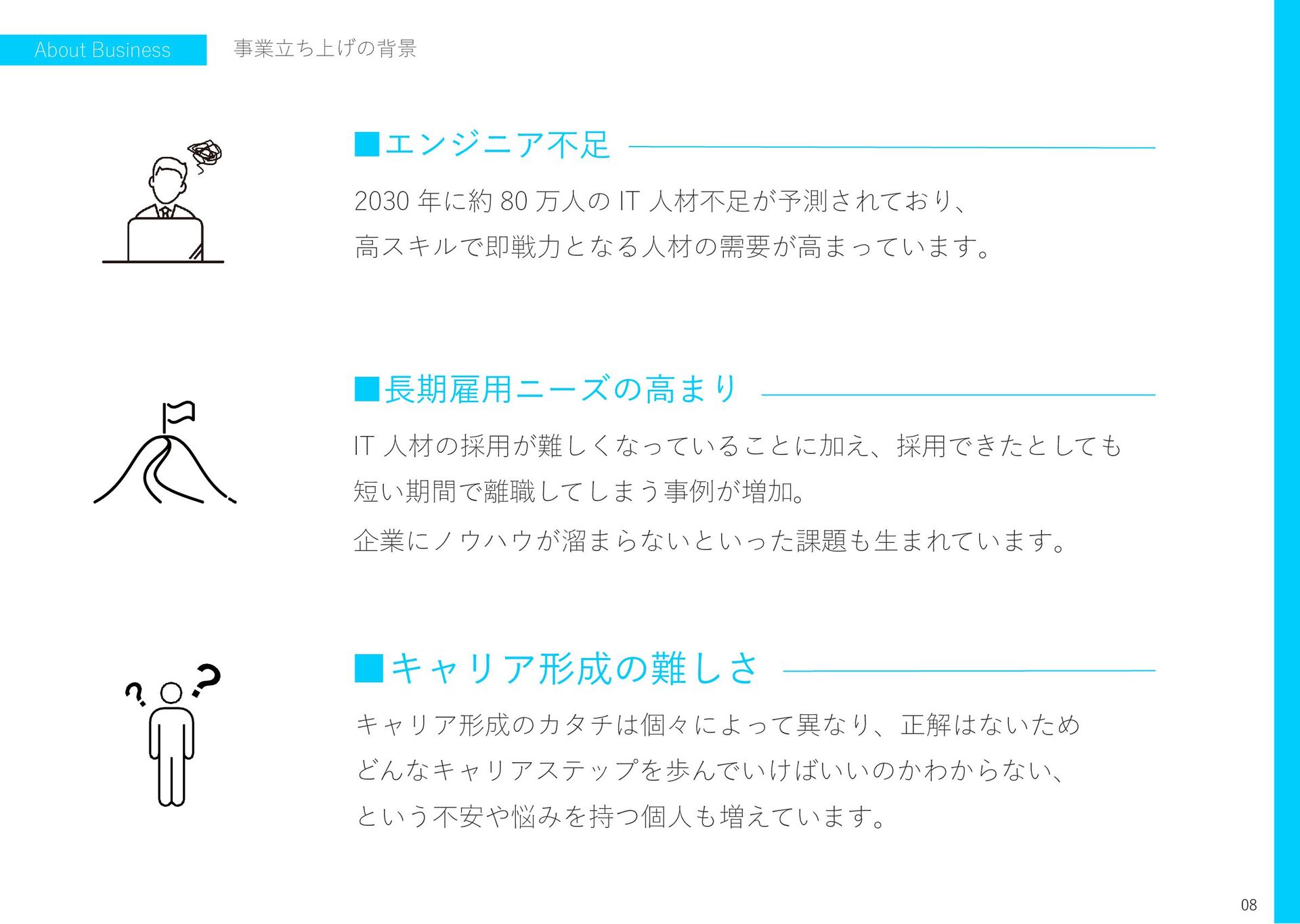 高スキルで即戦力となる人材の需要が高まっています。 ▪長期雇用ニーズの高まり IT 人材の採用が難しくなっていることに加え、採用できたとしても 短い期間で離職してしまう事例が増加。 企業にノウハウが溜まらないといった課題も生まれています。 ▪キャリア形成の難しさ キャリア形成のカタチは個々によって異なり、正解はないため どんなキャリアステップを歩んでいけばいいのかわからない、 という不安や悩みを持つ個人も増えています。 08