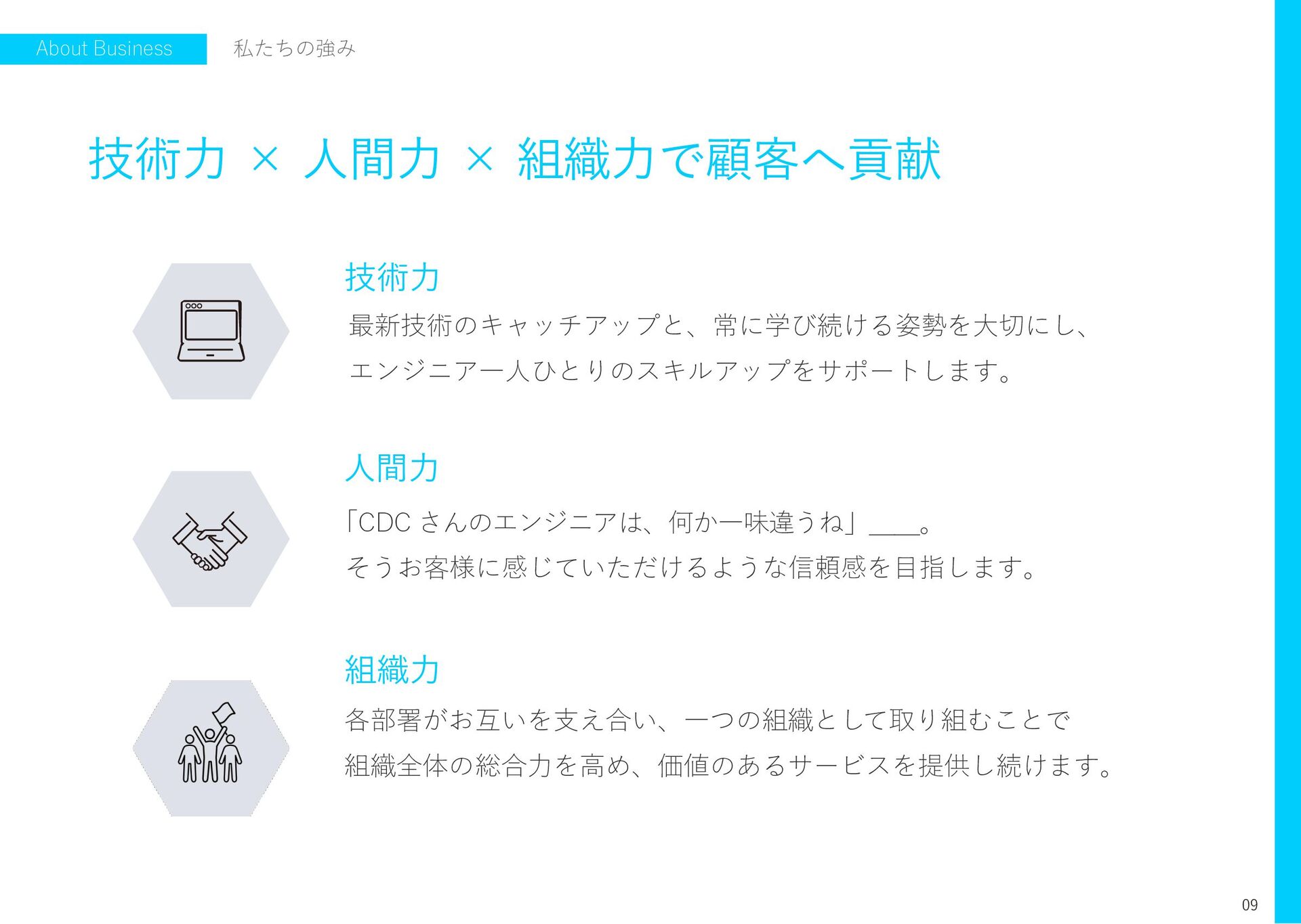技術力 × 人間力 × 組織力で顧客へ貢献 技術力 最新技術のキャッチアップと、常に学び続ける姿勢を大切にし、 エンジニア一人ひとりのスキルアップをサポートします。 人間力 「CDC