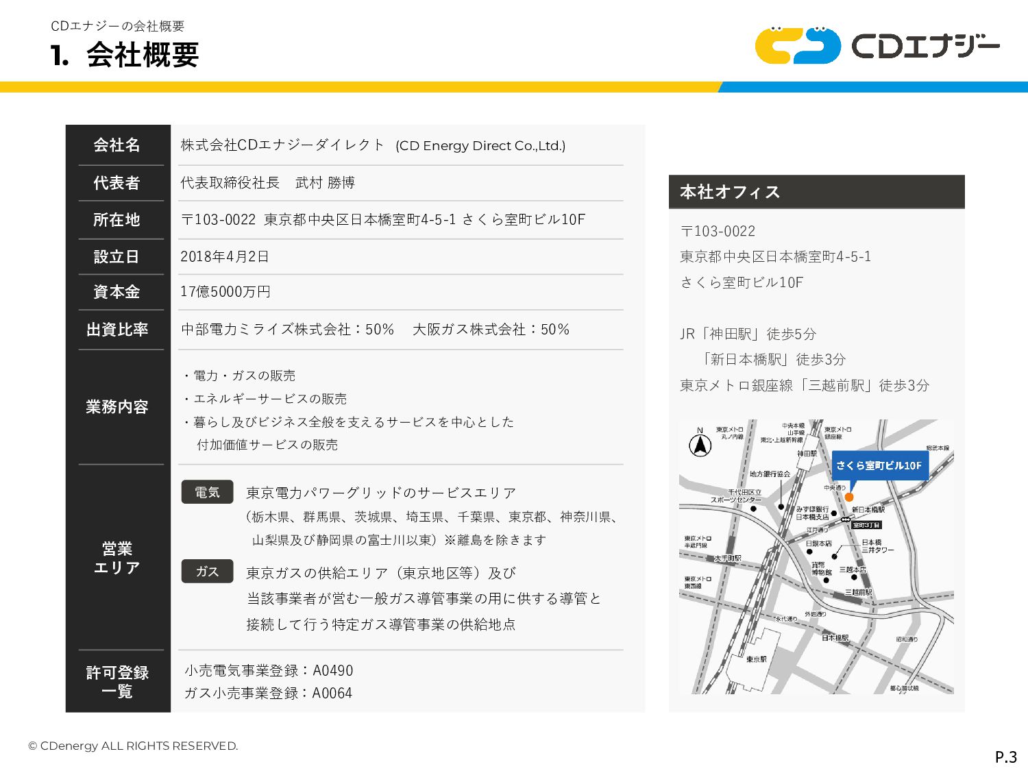 (CD Energy Direct Co.,Ltd.) 代表者 代表取締役社長 武村 勝博 所在地 〒103-0022 東京都中央区日本橋室町4-5-1 さくら室町ビル10F 設立日 2018年4月2日 資本金 17億5000万円 出資比率 中部電力ミライズ株式会社:50% 大阪ガス株式会社:50% 業務内容 ・電力・ガスの販売 ・エネルギーサービスの販売 ・暮らし及びビジネス全般を支えるサービスを中心とした 付加価値サービスの販売 営業 エリア 許可登録 一覧 〒103-0022 東京都中央区日本橋室町4-5-1 さくら室町ビル10F JR「神田駅」徒歩5分 「新日本橋駅」徒歩3分 東京メトロ銀座線「三越前駅」徒歩3分 CDエナジーの会社概要 東京ガスの供給エリア(東京地区等)及び 当該事業者が営む一般ガス導管事業の用に供する導管と 接続して行う特定ガス導管事業の供給地点 (栃木県、群馬県、茨城県、埼玉県、千葉県、東京都、神奈川県、 山梨県及び静岡県の富士川以東)※離島を除きます 電気 ガス 東京電力パワーグリッドのサービスエリア 本社オフィス 小売電気事業登録:A0490 ガス小売事業登録:A0064