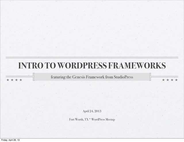 huge community behind it. This makes it much easier to get your support questions answered. http://www.wpbeginner.com/beginners-guide/what-is-a-theme-framework/ Friday, April 26, 13