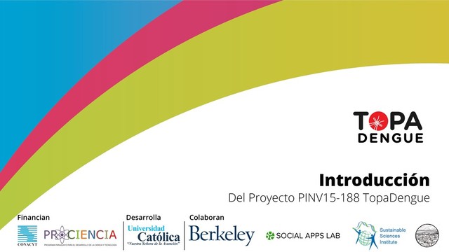 Presentación introductoria del Proyecto TopaDengue. TopaDengue es un proyecto de investigación, financiado por el Conacyt de Paraguay, que lleva adelante un programa de vigilancia entomológica comunitaria para la reducción de los niveles de infestación del Aedes aegypti, y la consecuente prevenciónd el Dengue y otras arbovirosis. El programa se sostiene sobre voluntarios locales, quiénes hacen uso de tecnologías para recolectar y socializar evidencias sobre el riesgo entomológico de la comunidad.