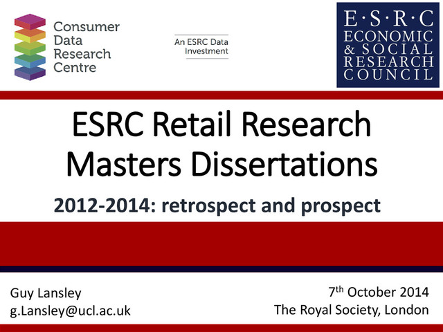 Research Masters Dissertation programme has been provided from the ESRC Consumer Data Research Centre We plan to launch the next cohort in November 2014. We would welcome suggestions of potential topics – please email Guy Lansley [email protected] in the first instance. Thank you for listening