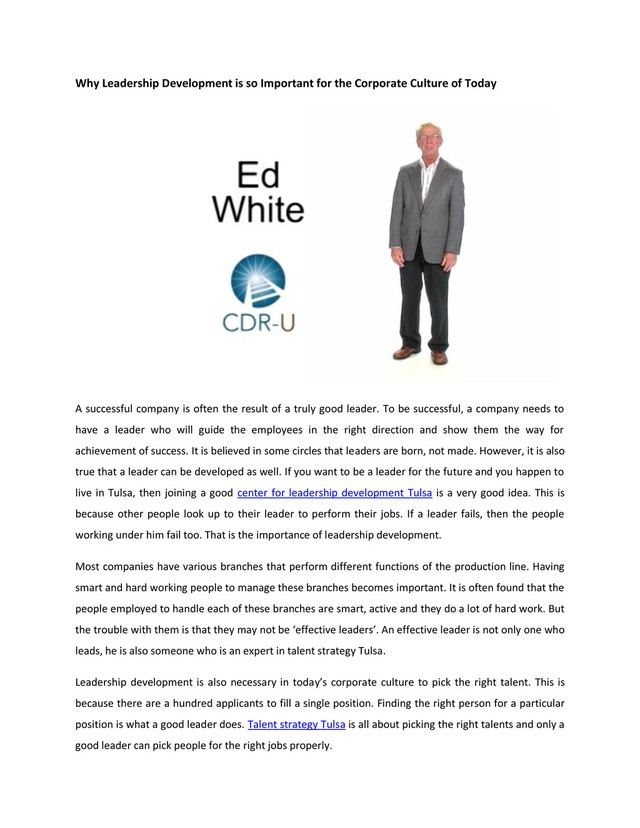 of Today A successful company is often the result of a truly good leader. To be successful, a company needs to have a leader who will guide the employees in the right direction and show them the way for achievement of success. It is believed in some circles that leaders are born, not made. However, it is also true that a leader can be developed as well. If you want to be a leader for the future and you happen to live in Tulsa, then joining a good center for leadership development Tulsa is a very good idea. This is because other people look up to their leader to perform their jobs. If a leader fails, then the people working under him fail too. That is the importance of leadership development. Most companies have various branches that perform different functions of the production line. Having smart and hard working people to manage these branches becomes important. It is often found that the people employed to handle each of these branches are smart, active and they do a lot of hard work. But the trouble with them is that they may not be ‘effective leaders’. An effective leader is not only one who leads, he is also someone who is an expert in talent strategy Tulsa. Leadership development is also necessary in today’s corporate culture to pick the right talent. This is because there are a hundred applicants to fill a single position. Finding the right person for a particular position is what a good leader does. Talent strategy Tulsa is all about picking the right talents and only a good leader can pick people for the right jobs properly.