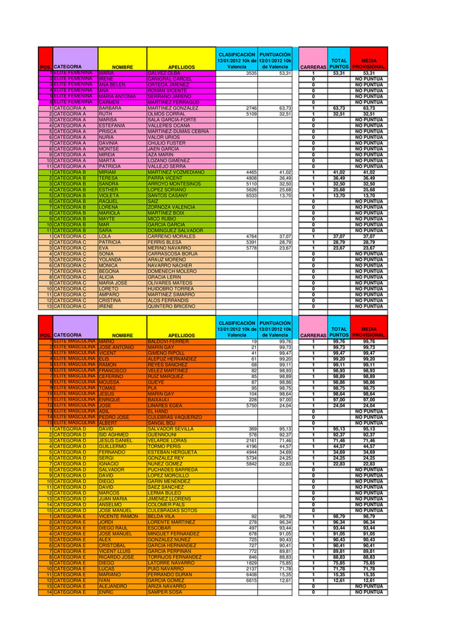 CATEGORIA E FRANCISCO MONTORO RUÍZ 0 NO PUNTUA 17 CATEGORIA E JUAN VELASCO MAGADAN 0 NO PUNTUA 18 CATEGORIA E JOSÉ MARÍA CUÉLLAR SÁEZ 0 NO PUNTUA 1 CATEGORIA F NACHO GUTIÉRREZ CATALUÑA 86 98,87 1 98,87 98,87 2 CATEGORIA F CARLOS CERVANTES COSTA 128 98,32 1 98,32 98,32 3 CATEGORIA F ALFREDO MARTÍNEZ MARTÍN 588 92,24 1 92,24 92,24 4 CATEGORIA F ÁLVARO MARTÍNEZ MARTÍNEZ 1432 81,09 1 81,09 81,09 5 CATEGORIA F JAVIER GÓMEZ BARRIOS 2750 63,68 1 63,68 63,68 6 CATEGORIA F QUIQUE MONFORT SÁNCHEZ 4642 38,68 1 38,68 38,68 7 CATEGORIA F RAFAEL HERRERA OLMOS 6440 14,93 1 14,93 14,93 8 CATEGORIA F JOSÉ FRANCISCO GARZÓN MELGOSO 6742 10,94 1 10,94 10,94 9 CATEGORIA F DANIEL PUERTA MARTÍN 0 NO PUNTUA 10 CATEGORIA F JAVI GIMÉNEZ GONZÁLEZ 0 NO PUNTUA 11 CATEGORIA F RAÚL LATORRE MONFORT 0 NO PUNTUA 12 CATEGORIA F ALBERTO ABENZA GALIETERO 0 NO PUNTUA 13 CATEGORIA F ALBERTO PRATS BONDÍA 0 NO PUNTUA 14 CATEGORIA F FRANCISCO JAVIER MONTESINOS SUÁREZ 0 NO PUNTUA 1 CATEGORIA G GUILLERMO NEVOT GUILLÉN 416 94,51 1 94,51 94,51 2 CATEGORIA G JOSÉ GABRIEL ASTILLERO PIZCUETA 908 88,01 1 88,01 88,01 3 CATEGORIA G EVERALDO SOUZA DA SILVA 1279 83,11 1 83,11 83,11 4 CATEGORIA G VICENTE MIRASOL RUBIO 1308 82,73 1 82,73 82,73 5 CATEGORIA G RAFAEL MARTÍNEZ GARCÍA 1726 77,21 1 77,21 77,21 6 CATEGORIA G ROMÁN PÉREZ 2437 67,81 1 67,81 67,81 7 CATEGORIA G OSCAR JIMÉNEZ MARTÍNEZ 0 NO PUNTUA 8 CATEGORIA G JOSÉ BIEDMA HERNÁNDEZ 0 NO PUNTUA 9 CATEGORIA G FRANCISCO MARTÍNEZ BOIX 0 NO PUNTUA 10 CATEGORIA G PASCUAL GRIÑO SANMARTÍN 0 NO PUNTUA 11 CATEGORIA G DARÍO SANMIGUEL CERVERA 0 NO PUNTUA 12 CATEGORIA G JORGE NAVARRO FRANCO 0 NO PUNTUA 13 CATEGORIA G JOSÉ LUÍS PÉREZ MARTÍNEZ 0 NO PUNTUA 14 CATEGORIA G JOSÉ MARÍA CABELLO CLOTET 0 NO PUNTUA 15 CATEGORIA G GUILLERMO HERNÁNDEZ JAESURÍA 0 NO PUNTUA 16 CATEGORIA G PEPE PASCUAL NAVARRO 0 NO PUNTUA 1 CATEGORIA H IVÁN RODRIGO PÉREZ 351 95,37 1 95,37 95,37 2 CATEGORIA H JOSÉ MANUEL CAÑAMARES VERDEJO 394 94,80 1 94,80 94,80 3 CATEGORIA H VICENTE BERNAT ISSENJOU 3695 51,19 1 51,19 51,19 4 CATEGORIA H JOSÉ VÍCTOR RICART SEGUÍ 4542 40,00 1 40,00 40,00 5 CATEGORIA H RUBÉN CANET LORENTE 5527 26,99 1 26,99 26,99 6 CATEGORIA H JUAN FUSTER ROSELLÓ 0 NO PUNTUA 7 CATEGORIA H MIGUEL OLIVER MARTORELL 0 NO PUNTUA 8 CATEGORIA H JOSÉ VICENTE SOTO NAVARRO 0 NO PUNTUA 9 CATEGORIA H ANTONIO MORAÑO CABRERA 0 NO PUNTUA 10 CATEGORIA H MARIO ORTEGA HARO 0 NO PUNTUA 11 CATEGORIA H JESÚS PABLO MORALES SUÁREZ-VARELA 0 NO PUNTUA 12 CATEGORIA H ERNESTO MIRASOL RUBIO 0 NO PUNTUA 13 CATEGORIA H FRANCISCO JAVIER DOMÉNECH VENTURA 0 NO PUNTUA 14 CATEGORIA H ENRIQUE PALMERO PALACIOS 0 NO PUNTUA 15 CATEGORIA H JOAQUÍN CANTERO MARTÍNEZ 0 NO PUNTUA 16 CATEGORIA H FÉLIX LOZANO AGUILAR 0 NO PUNTUA 17 CATEGORIA H ANGEL FABIÁN 0 NO PUNTUA 1 CATEGORIA I JOSÉ LUÍS OÑATE CEBRIÁN 382 94,96 1 94,96 94,96 2 CATEGORIA I ENRIQUE CERVERA DOMINGO 628 91,71 1 91,71 91,71 3 CATEGORIA I ENRIQUE AVIA TAUSTE 1107 85,38 1 85,38 85,38 4 CATEGORIA I JOSÉ MARÍA CASTRO PÉREZ 1132 85,05 1 85,05 85,05 5 CATEGORIA I MIGUEL ÁNGEL MARTÍNEZ MARTÍNEZ 1434 81,06 1 81,06 81,06 6 CATEGORIA I ESTEBAN SÁNCHEZ PUIG 1989 73,73 1 73,73 73,73 7 CATEGORIA I LUÍS MARTÍNEZ SOLAZ 1990 73,72 1 73,72 73,72 8 CATEGORIA I SANTIAGO PARDO LÓPEZ-FANDO 4353 42,50 1 42,50 42,50 9 CATEGORIA I AURELIO BARROSO LÓPEZ 0 NO PUNTUA 10 CATEGORIA I SALVADOR COSTA HERVÁS 0 NO PUNTUA 11 CATEGORIA I JOSÉ ANTONIO BERMEJO RODRÍGUEZ 0 NO PUNTUA 12 CATEGORIA I JOSÉ LÓPEZ RAYA 0 NO PUNTUA 13 CATEGORIA I VICENTE MEDINA MESAS 0 NO PUNTUA 14 CATEGORIA I JOSE ANTONIO MARTI MATEU 0 NO PUNTUA 1 CATEGORIA J XAVI LLUCH CRESPO 507 93,31 1 93,31 93,31 2 CATEGORIA J JUAN CARLOS SALA ROJAS 575 92,41 1 92,41 92,41 3 CATEGORIA J JOSE MANUEL ALBIOL FERNÁNDEZ 577 92,39 1 92,39 92,39 4 CATEGORIA J MOISÉS LAPARRA CLAUSÍ 1212 84,00 1 84,00 84,00 5 CATEGORIA J JOSÉ MIGUEL QUILES ADSUARA 2268 70,05 1 70,05 70,05 6 CATEGORIA J JOSÉ FRANCISCO PARDO HERNÁNDEZ 4762 37,10 1 37,10 37,10 7 CATEGORIA J JOAQUIM GARCÍA I ORTELLS 5075 32,96 1 32,96 32,96 8 CATEGORIA J ENRIQUE CANELLES 7203 4,85 1 4,85 4,85 9 CATEGORIA J SALVADOR PUCHADES LLOBREGAT 0 NO PUNTUA 10 CATEGORIA J EDUARDO TORRES AGUILAR 0 NO PUNTUA 11 CATEGORIA J KIKE GALLEGO MARÍN 0 NO PUNTUA 1 CATEGORIA K PAULINO SÁEZ RODRÍGUEZ 1290 82,97 1 82,97 82,97 2 CATEGORIA K PACO PONZ MIGUEL 1318 82,60 1 82,60 82,60 3 CATEGORIA K MARKOLO SAZ CAMPOS 2039 73,07 1 73,07 73,07 4 CATEGORIA K JUAN CARLOS MOMPARLER PECHUÁN 2281 69,87 1 69,87 69,87 5 CATEGORIA K DIEGO GARCÍA ARCHILLA 2347 69,00 1 69,00 69,00 6 CATEGORIA K GREGORIO CASTELLANO VIDAL 3952 47,80 1 47,80 47,80 7 CATEGORIA K JOSEP MANEL VERT PRIETO 5045 33,36 1 33,36 33,36 8 CATEGORIA K EMILIO ALCALDE BLANQUER 5539 26,83 1 26,83 26,83 9 CATEGORIA K VICENTE ALOY MARTINEZ 7347 2,94 1 2,94 2,94 10 CATEGORIA K JOSÉ MARÍA SOLER FELIU 0 NO PUNTUA 11 CATEGORIA K JAVIER MONTESINOS ARGELICH 0 NO PUNTUA 12 CATEGORIA K MIGUEL LÓPEZ SABATER 0 NO PUNTUA 13 CATEGORIA K HERMÓGENES LLANEZA PÉREZ 0 NO PUNTUA 14 CATEGORIA K JUAN CHINER PEREZ 0 NO PUNTUA 7569