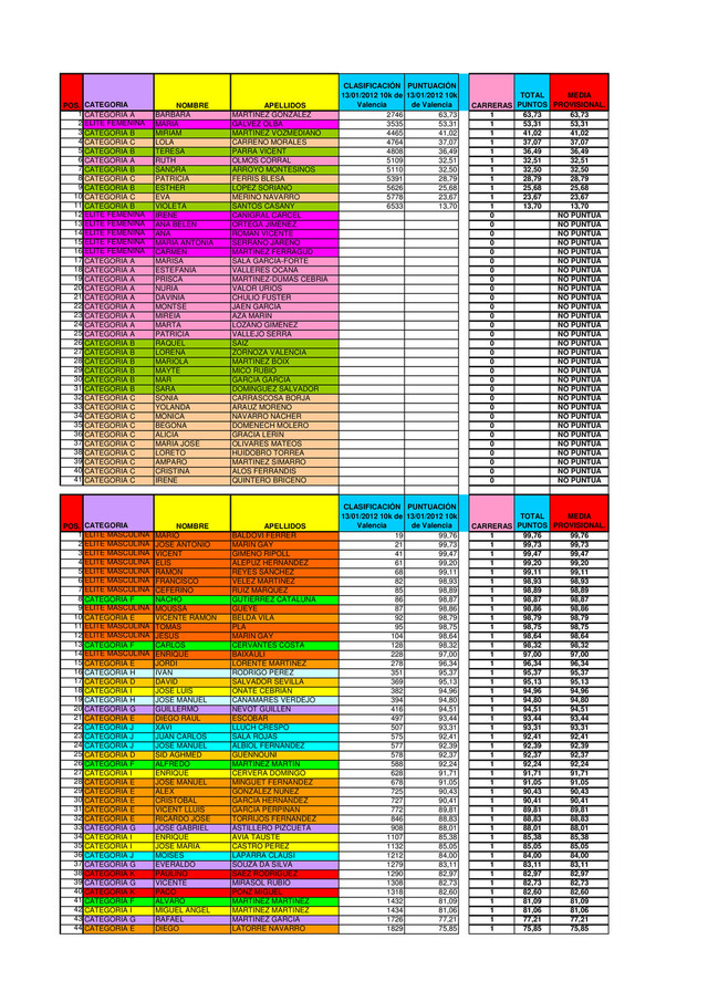 13/01/2012 10k de Valencia CARRERAS TOTAL PUNTOS MEDIA PROVISIONAL. 1 CATEGORIA A BÁRBARA MARTÍNEZ GONZÁLEZ 2746 63,73 1 63,73 63,73 2 ELITE FEMENINA MARÍA GÁLVEZ OLBA 3535 53,31 1 53,31 53,31 3 CATEGORIA B MIRIAM MARTÍNEZ VOZMEDIANO 4465 41,02 1 41,02 41,02 4 CATEGORIA C LOLA CARREÑO MORALES 4764 37,07 1 37,07 37,07 5 CATEGORIA B TERESA PARRA VICENT 4808 36,49 1 36,49 36,49 6 CATEGORIA A RUTH OLMOS CORRAL 5109 32,51 1 32,51 32,51 7 CATEGORIA B SANDRA ARROYO MONTESINOS 5110 32,50 1 32,50 32,50 8 CATEGORIA C PATRICIA FERRIS BLESA 5391 28,79 1 28,79 28,79 9 CATEGORIA B ESTHER LÓPEZ SORIANO 5626 25,68 1 25,68 25,68 10 CATEGORIA C EVA MERINO NAVARRO 5778 23,67 1 23,67 23,67 11 CATEGORIA B VIOLETA SANTOS CASANY 6533 13,70 1 13,70 13,70 12 ELITE FEMENINA IRENE CAÑIGRAL CÁRCEL 0 NO PUNTUA 13 ELITE FEMENINA ANA BELÉN ORTEGA JIMÉNEZ 0 NO PUNTUA 14 ELITE FEMENINA ANA ROMÁN VICENTE 0 NO PUNTUA 15 ELITE FEMENINA MARÍA ANTONIA SERRANO JAREÑO 0 NO PUNTUA 16 ELITE FEMENINA CARMEN MARTÍNEZ FERRAGUD 0 NO PUNTUA 17 CATEGORIA A MARISA SALA GARCÍA-FORTE 0 NO PUNTUA 18 CATEGORIA A ESTEFANÍA VALLERES OCAÑA 0 NO PUNTUA 19 CATEGORIA A PRISCA MARTÍNEZ-DUMAS CEBRIÁ 0 NO PUNTUA 20 CATEGORIA A NURIA VALOR URIOS 0 NO PUNTUA 21 CATEGORIA A DAVINIA CHULIÓ FUSTER 0 NO PUNTUA 22 CATEGORIA A MONTSE JAÉN GARCÍA 0 NO PUNTUA 23 CATEGORIA A MIREIA AZA MARÍN 0 NO PUNTUA 24 CATEGORIA A MARTA LOZANO GIMÉNEZ 0 NO PUNTUA 25 CATEGORIA A PATRICIA VALLEJO SERRA 0 NO PUNTUA 26 CATEGORIA B RAQUEL SAIZ 0 NO PUNTUA 27 CATEGORIA B LORENA ZORNOZA VALENCIA 0 NO PUNTUA 28 CATEGORIA B MARIOLA MARTÍNEZ BOIX 0 NO PUNTUA 29 CATEGORIA B MAYTE MICÓ RUBIO 0 NO PUNTUA 30 CATEGORIA B MAR GARCIA GARCIA 0 NO PUNTUA 31 CATEGORIA B SARA DOMINGUEZ SALVADOR 0 NO PUNTUA 32 CATEGORIA C SONIA CARRASCOSA BORJA 0 NO PUNTUA 33 CATEGORIA C YOLANDA ARAUZ MORENO 0 NO PUNTUA 34 CATEGORIA C MÓNICA NAVARRO NÁCHER 0 NO PUNTUA 35 CATEGORIA C BEGOÑA DOMÉNECH MOLERO 0 NO PUNTUA 36 CATEGORIA C ALICIA GRACIA LERIN 0 NO PUNTUA 37 CATEGORIA C MARÍA JOSÉ OLIVARES MATEOS 0 NO PUNTUA 38 CATEGORIA C LORETO HUIDOBRO TORREA 0 NO PUNTUA 39 CATEGORIA C AMPARO MARTÍNEZ SIMARRO 0 NO PUNTUA 40 CATEGORIA C CRISTINA ALÓS FERRANDIS 0 NO PUNTUA 41 CATEGORIA C IRENE QUINTERO BRICEÑO 0 NO PUNTUA POS. CATEGORIA NOMBRE APELLIDOS CLASIFICACIÓN 13/01/2012 10k de Valencia PUNTUACIÓN 13/01/2012 10k de Valencia CARRERAS TOTAL PUNTOS MEDIA PROVISIONAL. 1 ELITE MASCULINA MARIO BALDOVÍ FERRER 19 99,76 1 99,76 99,76 2 ELITE MASCULINA JOSE ANTONIO MARÍN GAY 21 99,73 1 99,73 99,73 3 ELITE MASCULINA VICENT GIMENO RIPOLL 41 99,47 1 99,47 99,47 4 ELITE MASCULINA ELIS ALEPUZ HERNÁNDEZ 61 99,20 1 99,20 99,20 5 ELITE MASCULINA RAMÓN REYES SÁNCHEZ 68 99,11 1 99,11 99,11 6 ELITE MASCULINA FRANCISCO VÉLEZ MARTÍNEZ 82 98,93 1 98,93 98,93 7 ELITE MASCULINA CEFERINO RUÍZ MÁRQUEZ 85 98,89 1 98,89 98,89 8 CATEGORIA F NACHO GUTIÉRREZ CATALUÑA 86 98,87 1 98,87 98,87 9 ELITE MASCULINA MOUSSA GUEYE 87 98,86 1 98,86 98,86 10 CATEGORIA E VICENTE RAMÓN BELDA VILA 92 98,79 1 98,79 98,79 11 ELITE MASCULINA TOMÁS PLA 95 98,75 1 98,75 98,75 12 ELITE MASCULINA JESÚS MARÍN GAY 104 98,64 1 98,64 98,64 13 CATEGORIA F CARLOS CERVANTES COSTA 128 98,32 1 98,32 98,32 14 ELITE MASCULINA ENRIQUE BAIXAULI 228 97,00 1 97,00 97,00 15 CATEGORIA E JORDI LORENTE MARTÍNEZ 278 96,34 1 96,34 96,34 16 CATEGORIA H IVÁN RODRIGO PÉREZ 351 95,37 1 95,37 95,37 17 CATEGORIA D DAVID SALVADOR SEVILLA 369 95,13 1 95,13 95,13 18 CATEGORIA I JOSÉ LUÍS OÑATE CEBRIÁN 382 94,96 1 94,96 94,96 19 CATEGORIA H JOSÉ MANUEL CAÑAMARES VERDEJO 394 94,80 1 94,80 94,80 20 CATEGORIA G GUILLERMO NEVOT GUILLÉN 416 94,51 1 94,51 94,51 21 CATEGORIA E DIEGO RAÚL ESCOBAR 497 93,44 1 93,44 93,44 22 CATEGORIA J XAVI LLUCH CRESPO 507 93,31 1 93,31 93,31 23 CATEGORIA J JUAN CARLOS SALA ROJAS 575 92,41 1 92,41 92,41 24 CATEGORIA J JOSE MANUEL ALBIOL FERNÁNDEZ 577 92,39 1 92,39 92,39 25 CATEGORIA D SID AGHMED GUENNOUNI 578 92,37 1 92,37 92,37 26 CATEGORIA F ALFREDO MARTÍNEZ MARTÍN 588 92,24 1 92,24 92,24 27 CATEGORIA I ENRIQUE CERVERA DOMINGO 628 91,71 1 91,71 91,71 28 CATEGORIA E JOSÉ MANUEL MINGUET FERNÁNDEZ 678 91,05 1 91,05 91,05 29 CATEGORIA E ALEX GONZÁLEZ NÚÑEZ 725 90,43 1 90,43 90,43 30 CATEGORIA E CRISTÓBAL GARCÍA HERNÁNDEZ 727 90,41 1 90,41 90,41 31 CATEGORIA E VICENT LLUIS GARCÍA PERPIÑAN 772 89,81 1 89,81 89,81 32 CATEGORIA E RICARDO JOSÉ TORRIJOS FERNÁNDEZ 846 88,83 1 88,83 88,83 33 CATEGORIA G JOSÉ GABRIEL ASTILLERO PIZCUETA 908 88,01 1 88,01 88,01 34 CATEGORIA I ENRIQUE AVIA TAUSTE 1107 85,38 1 85,38 85,38 35 CATEGORIA I JOSÉ MARÍA CASTRO PÉREZ 1132 85,05 1 85,05 85,05 36 CATEGORIA J MOISÉS LAPARRA CLAUSÍ 1212 84,00 1 84,00 84,00 37 CATEGORIA G EVERALDO SOUZA DA SILVA 1279 83,11 1 83,11 83,11 38 CATEGORIA K PAULINO SÁEZ RODRÍGUEZ 1290 82,97 1 82,97 82,97 39 CATEGORIA G VICENTE MIRASOL RUBIO 1308 82,73 1 82,73 82,73 40 CATEGORIA K PACO PONZ MIGUEL 1318 82,60 1 82,60 82,60 41 CATEGORIA F ÁLVARO MARTÍNEZ MARTÍNEZ 1432 81,09 1 81,09 81,09 42 CATEGORIA I MIGUEL ÁNGEL MARTÍNEZ MARTÍNEZ 1434 81,06 1 81,06 81,06 43 CATEGORIA G RAFAEL MARTÍNEZ GARCÍA 1726 77,21 1 77,21 77,21 44 CATEGORIA E DIEGO LATORRE NAVARRO 1829 75,85 1 75,85 75,85