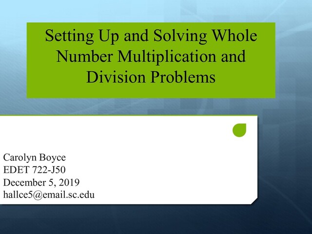 The Prototype was created to review multi-digit multiplication and division problems using 4th and 5th Grade South Carolina Standards of Mathematics. The Prototype reviewed the step-by-step procedures on solving multiplication and division problems, provided practice problems for the learner, and concluded with a posttest to determine the effectiveness of the prototype.