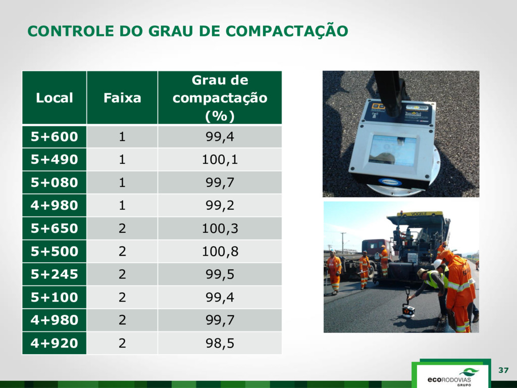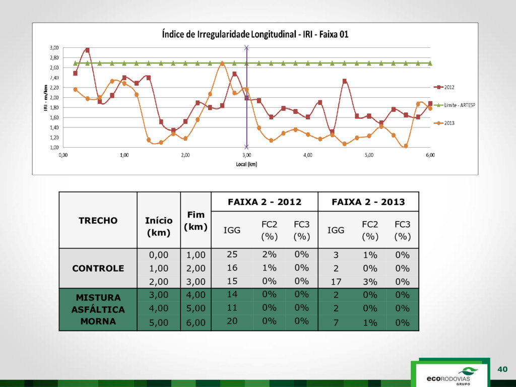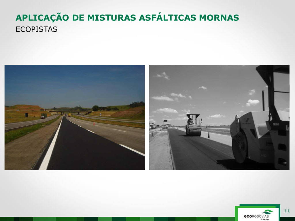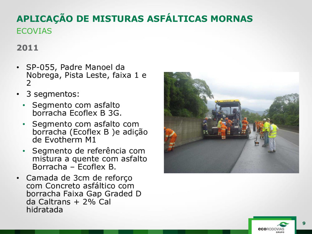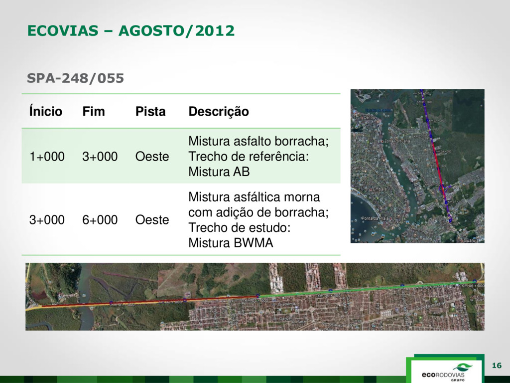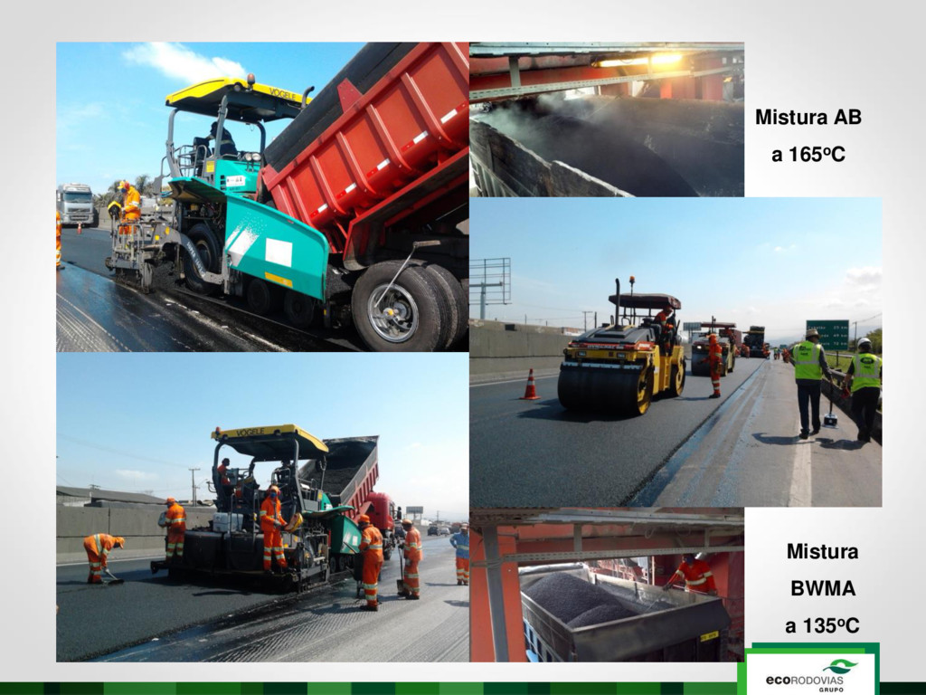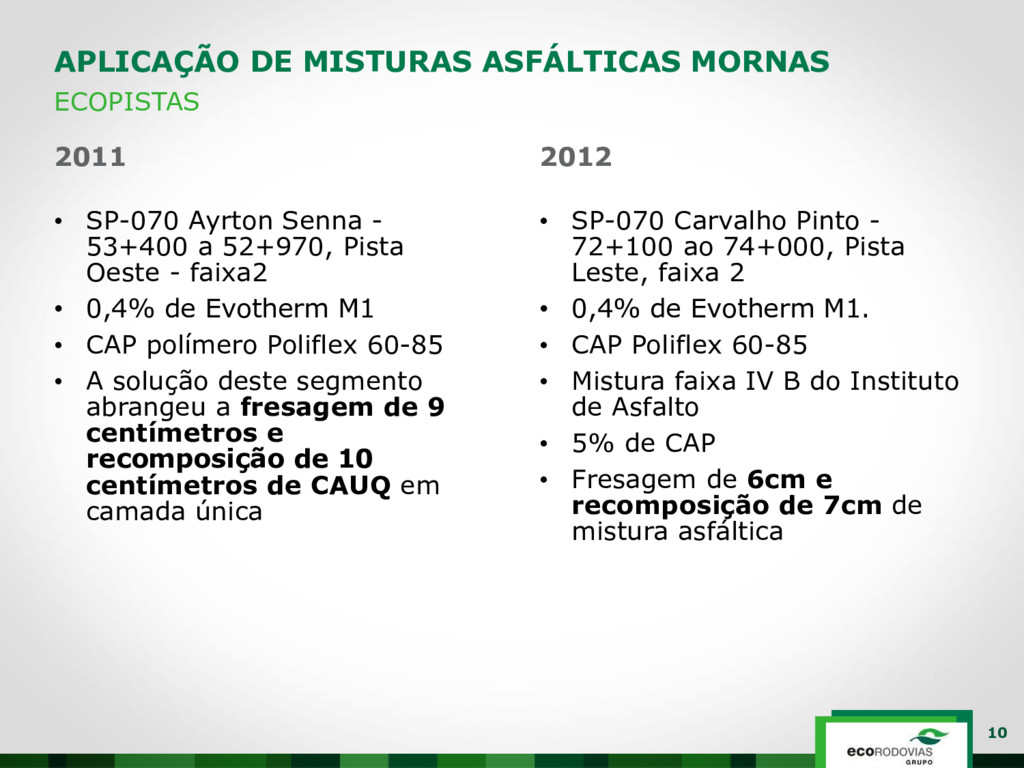 - 53+400 a 52+970, Pista Oeste - faixa2 • 0,4% de Evotherm M1 • CAP polímero Poliflex 60-85 • A solução deste segmento abrangeu a fresagem de 9 centímetros e recomposição de 10 centímetros de CAUQ em camada única 2012 • SP-070 Carvalho Pinto - 72+100 ao 74+000, Pista Leste, faixa 2 • 0,4% de Evotherm M1. • CAP Poliflex 60-85 • Mistura faixa IV B do Instituto de Asfalto • 5% de CAP • Fresagem de 6cm e recomposição de 7cm de mistura asfáltica 10 ECOPISTAS