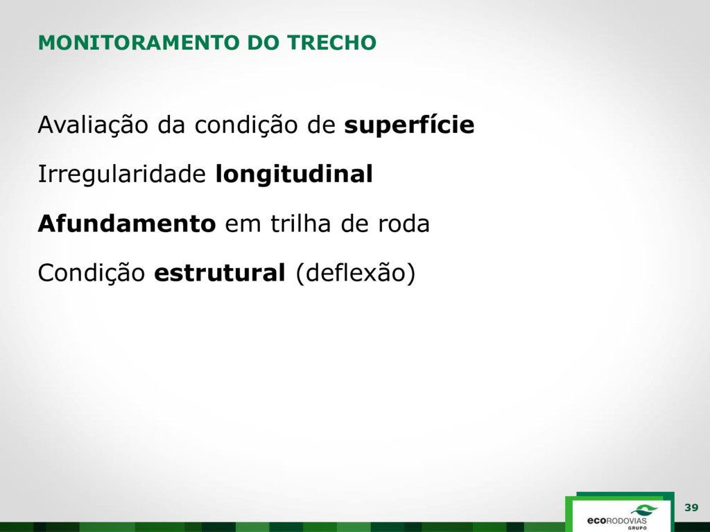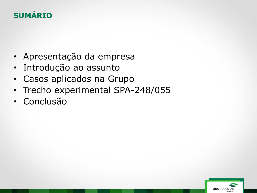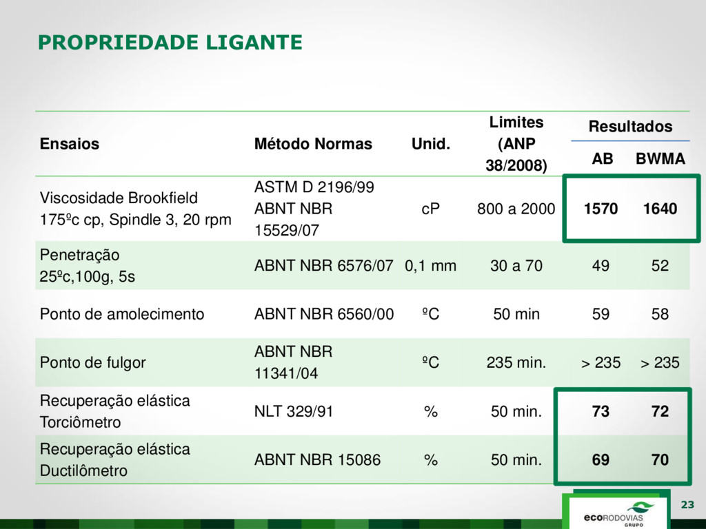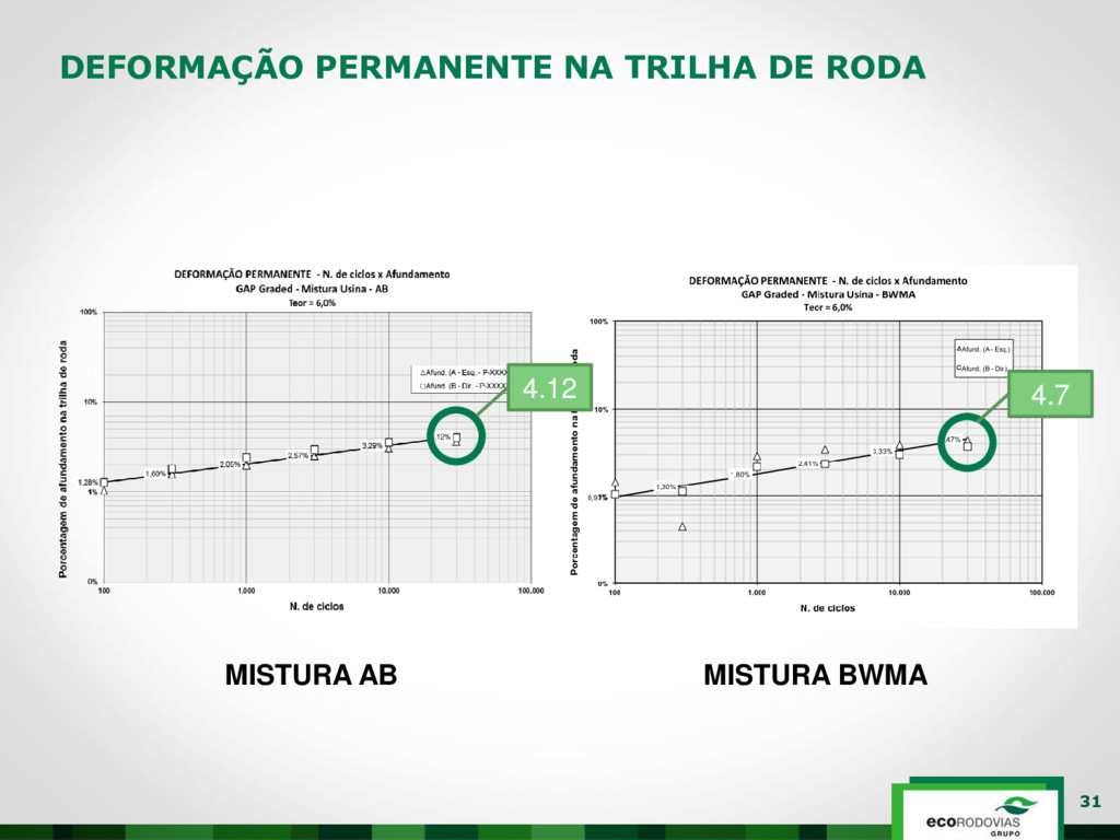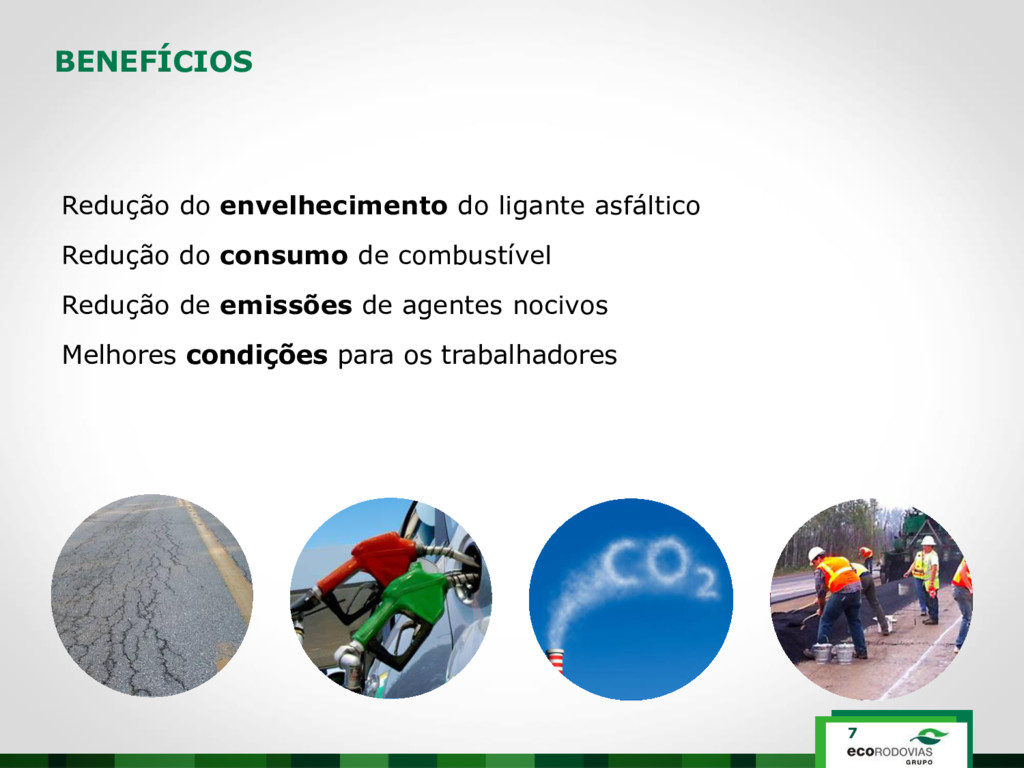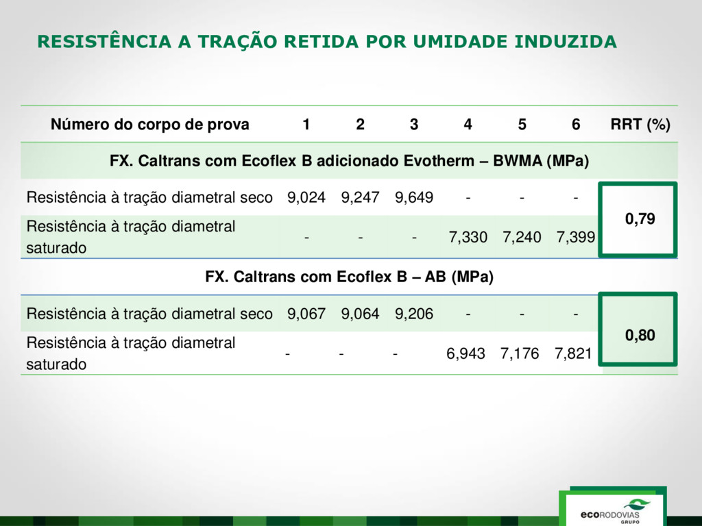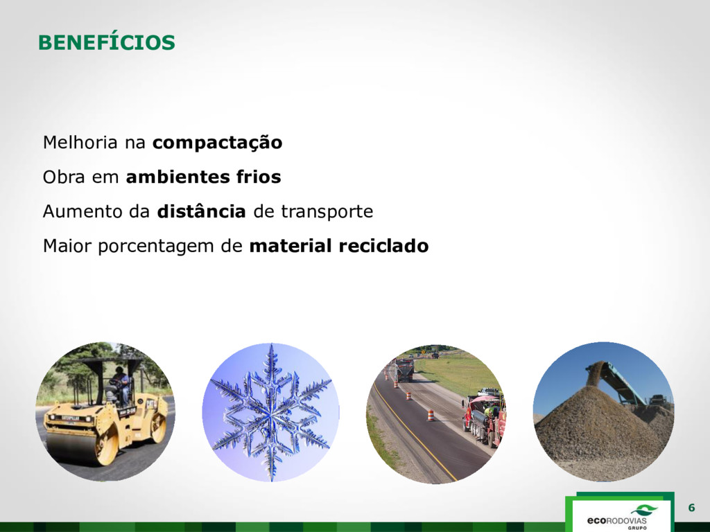 - 53+400 a 52+970, Pista Oeste - faixa2 • 0,4% de Evotherm M1 • CAP polímero Poliflex 60-85 • A solução deste segmento abrangeu a fresagem de 9 centímetros e recomposição de 10 centímetros de CAUQ em camada única 2012 • SP-070 Carvalho Pinto - 72+100 ao 74+000, Pista Leste, faixa 2 • 0,4% de Evotherm M1. • CAP Poliflex 60-85 • Mistura faixa IV B do Instituto de Asfalto • 5% de CAP • Fresagem de 6cm e recomposição de 7cm de mistura asfáltica 10 ECOPISTAS