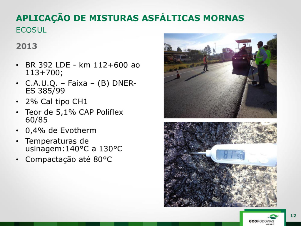 - km 112+600 ao 113+700; • C.A.U.Q. – Faixa – (B) DNER- ES 385/99 • 2% Cal tipo CH1 • Teor de 5,1% CAP Poliflex 60/85 • 0,4% de Evotherm • Temperaturas de usinagem:140°C a 130°C • Compactação até 80°C 12 ECOSUL