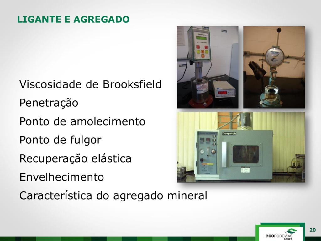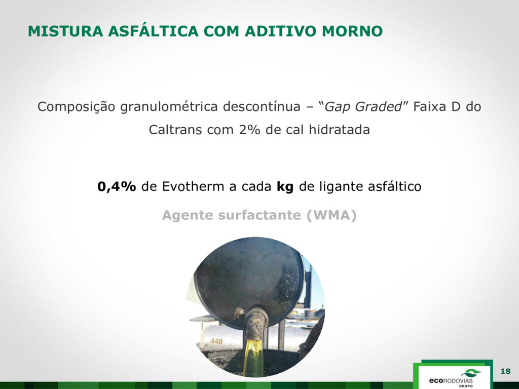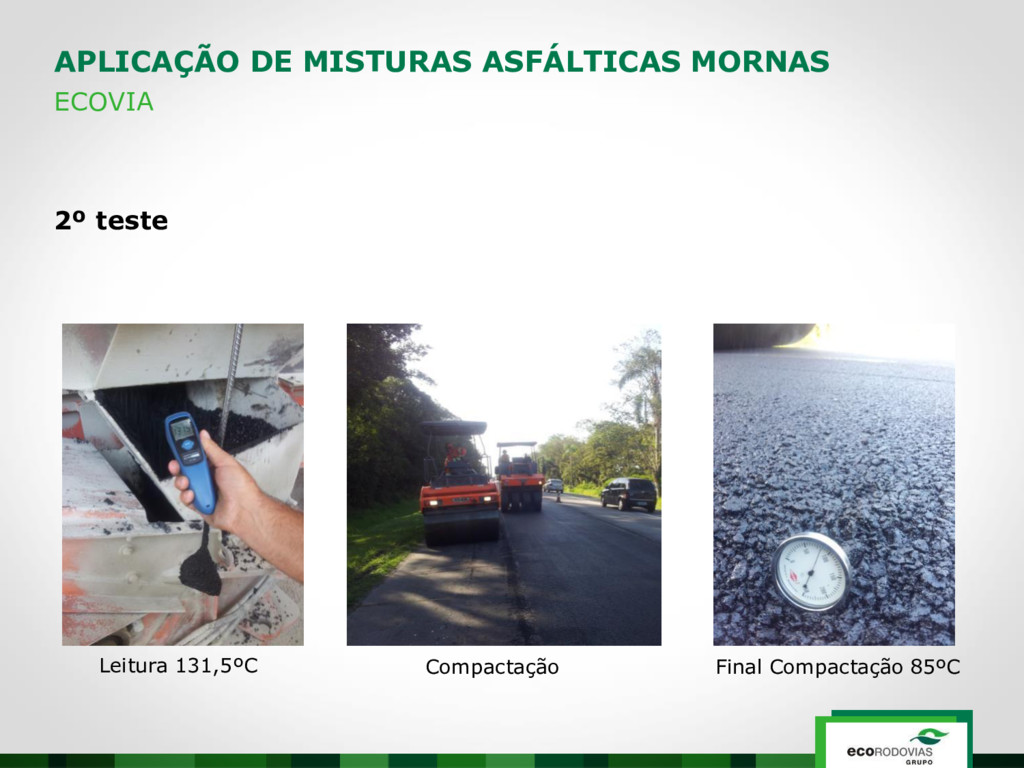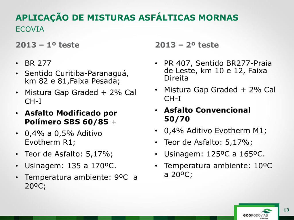 BR 277 • Sentido Curitiba-Paranaguá, km 82 e 81,Faixa Pesada; • Mistura Gap Graded + 2% Cal CH-I • Asfalto Modificado por Polímero SBS 60/85 + • 0,4% a 0,5% Aditivo Evotherm R1; • Teor de Asfalto: 5,17%; • Usinagem: 135 a 170ºC. • Temperatura ambiente: 9ºC a 20ºC; 2013 – 2º teste • PR 407, Sentido BR277-Praia de Leste, km 10 e 12, Faixa Direita • Mistura Gap Graded + 2% Cal CH-I • Asfalto Convencional 50/70 • 0,4% Aditivo Evotherm M1; • Teor de Asfalto: 5,17%; • Usinagem: 125ºC a 165ºC. • Temperatura ambiente: 10ºC a 20ºC; 13 ECOVIA