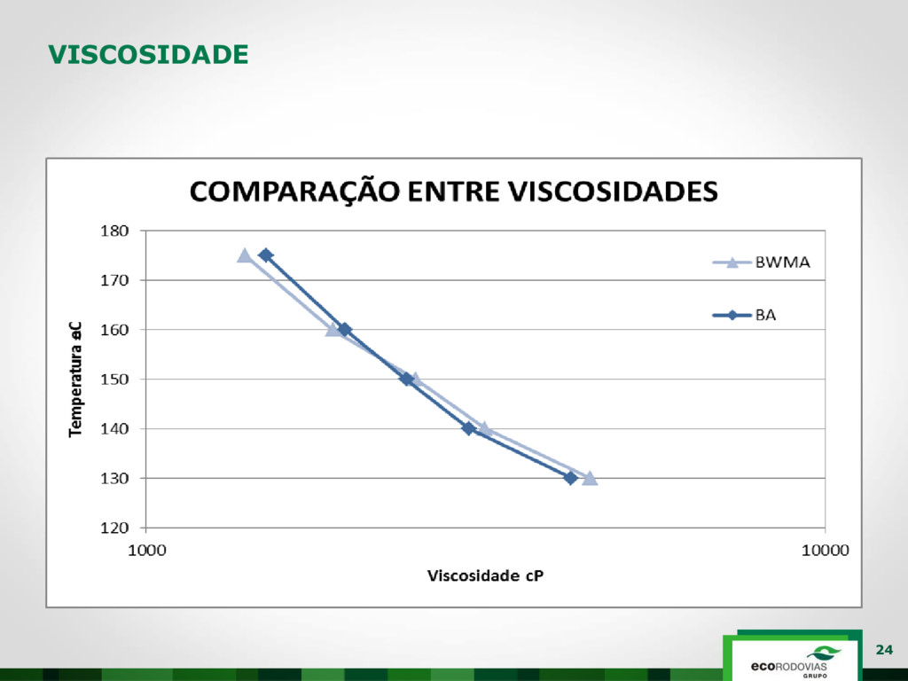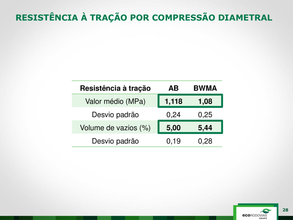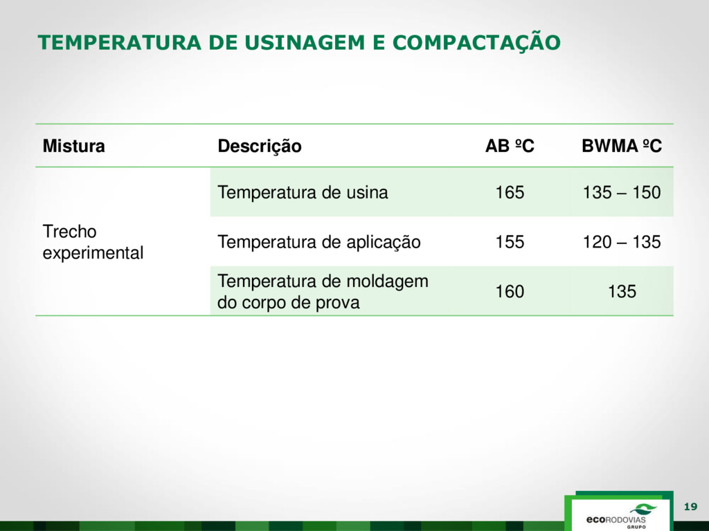 BWMA ºC Trecho experimental Temperatura de usina 165 135 – 150 Temperatura de aplicação 155 120 – 135 Temperatura de moldagem do corpo de prova 160 135
