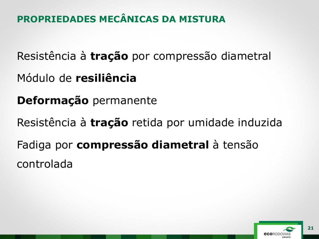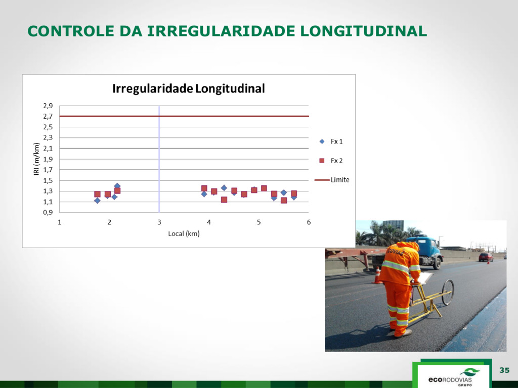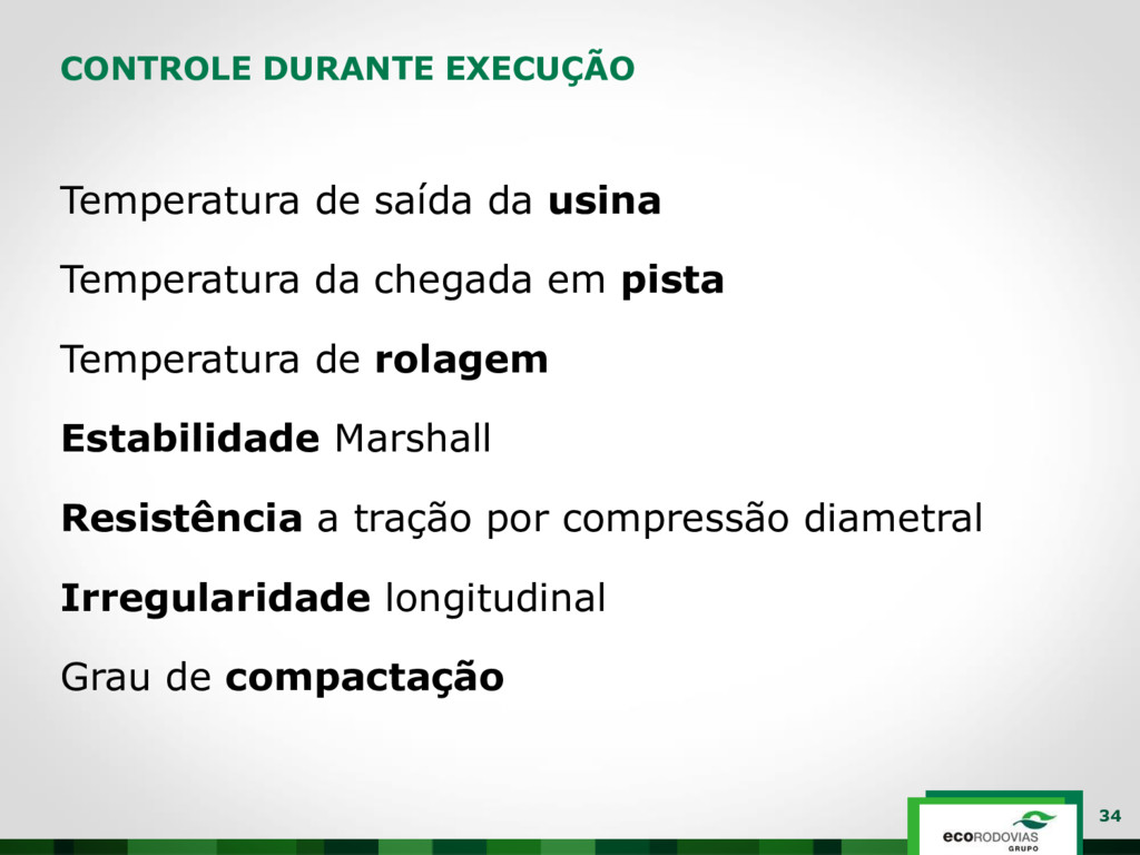 chegada em pista Temperatura de rolagem Estabilidade Marshall Resistência a tração por compressão diametral Irregularidade longitudinal Grau de compactação 34