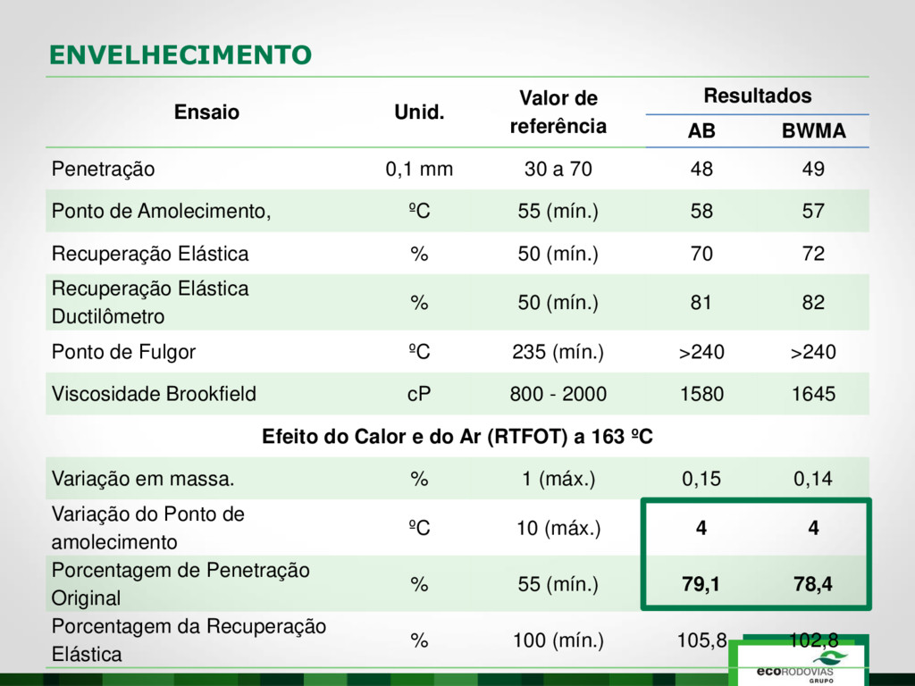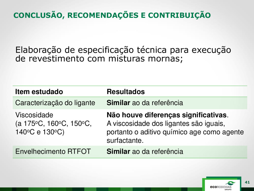 de revestimento com misturas mornas; 41 Item estudado Resultados Caracterização do ligante Similar ao da referência Viscosidade (a 175oC, 160oC, 150oC, 140oC e 130oC) Não houve diferenças significativas. A viscosidade dos ligantes são iguais, portanto o aditivo químico age como agente surfactante. Envelhecimento RTFOT Similar ao da referência
