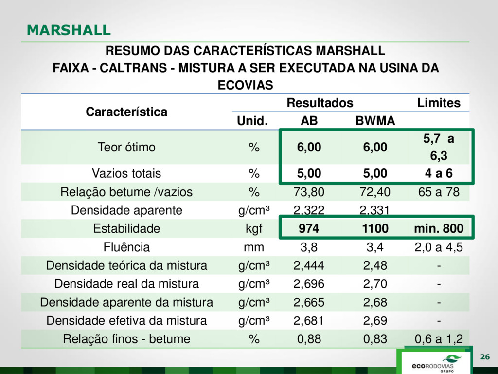 MISTURA A SER EXECUTADA NA USINA DA ECOVIAS Característica Resultados Limites Unid. AB BWMA Teor ótimo % 6,00 6,00 5,7 a 6,3 Vazios totais % 5,00 5,00 4 a 6 Relação betume /vazios % 73,80 72,40 65 a 78 Densidade aparente g/cm³ 2,322 2,331 Estabilidade kgf 974 1100 min. 800 Fluência mm 3,8 3,4 2,0 a 4,5 Densidade teórica da mistura g/cm³ 2,444 2,48 - Densidade real da mistura g/cm³ 2,696 2,70 - Densidade aparente da mistura g/cm³ 2,665 2,68 - Densidade efetiva da mistura g/cm³ 2,681 2,69 - Relação finos - betume % 0,88 0,83 0,6 a 1,2