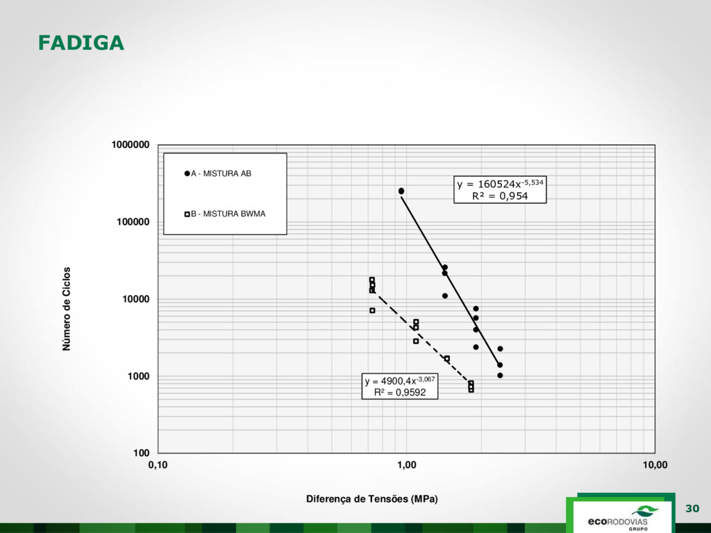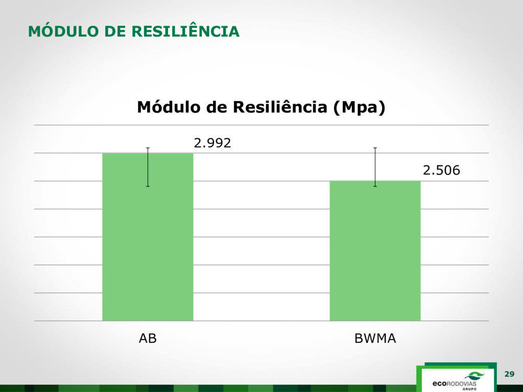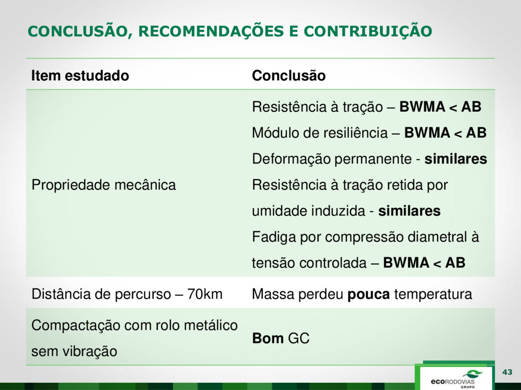 à tração – BWMA < AB Módulo de resiliência – BWMA < AB Deformação permanente - similares Resistência à tração retida por umidade induzida - similares Fadiga por compressão diametral à tensão controlada – BWMA < AB Distância de percurso – 70km Massa perdeu pouca temperatura Compactação com rolo metálico sem vibração Bom GC 43