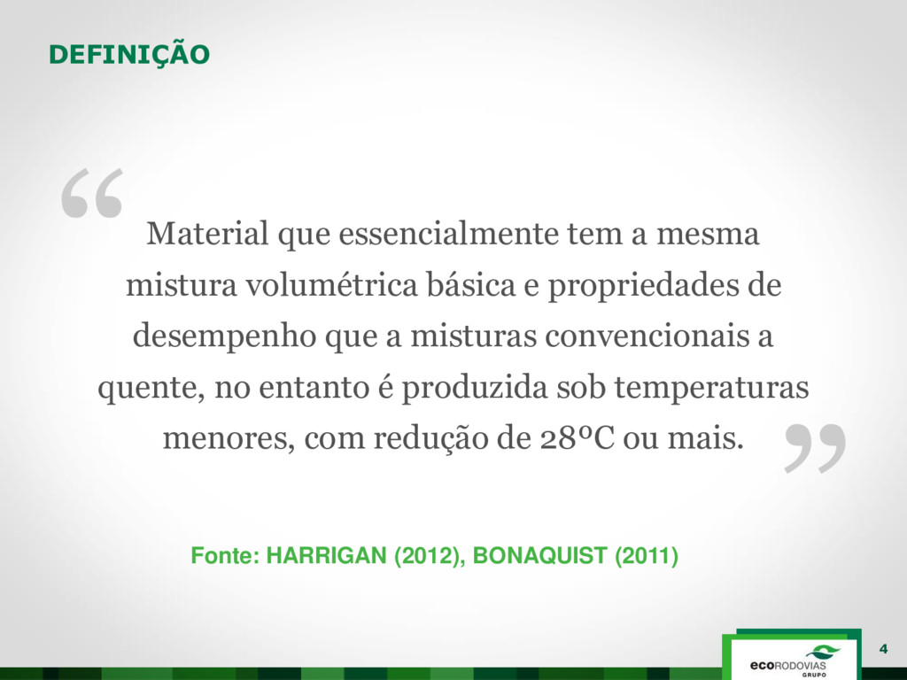 volumétrica básica e propriedades de desempenho que a misturas convencionais a quente, no entanto é produzida sob temperaturas menores, com redução de 28ºC ou mais. Fonte: HARRIGAN (2012), BONAQUIST (2011) 4