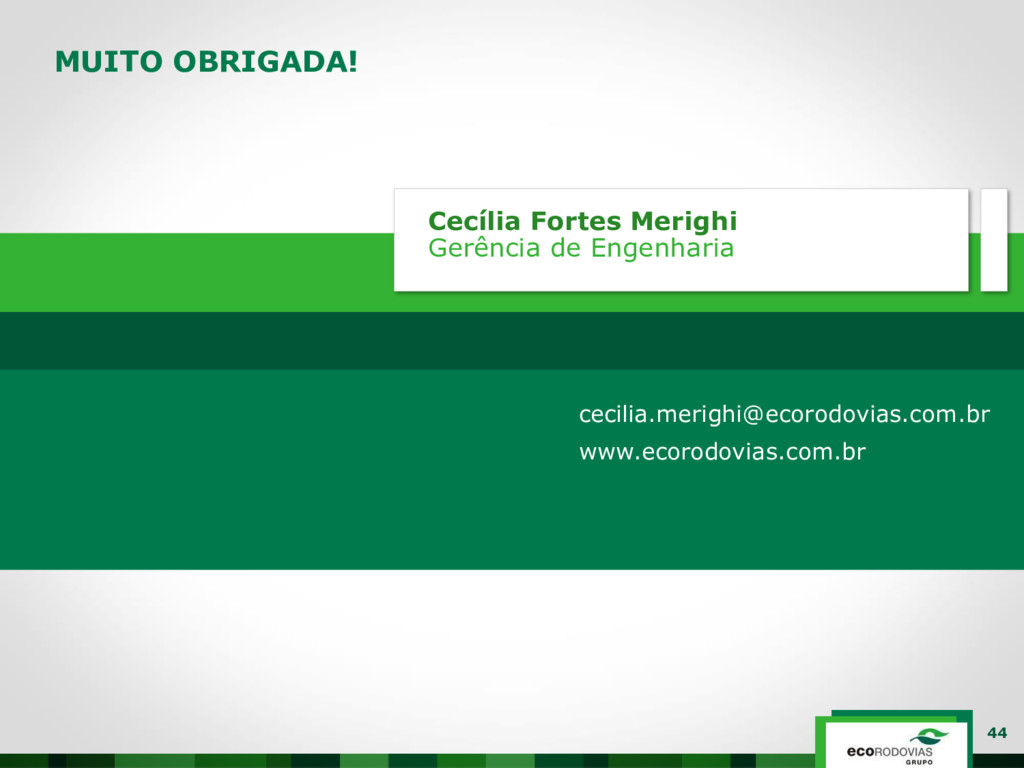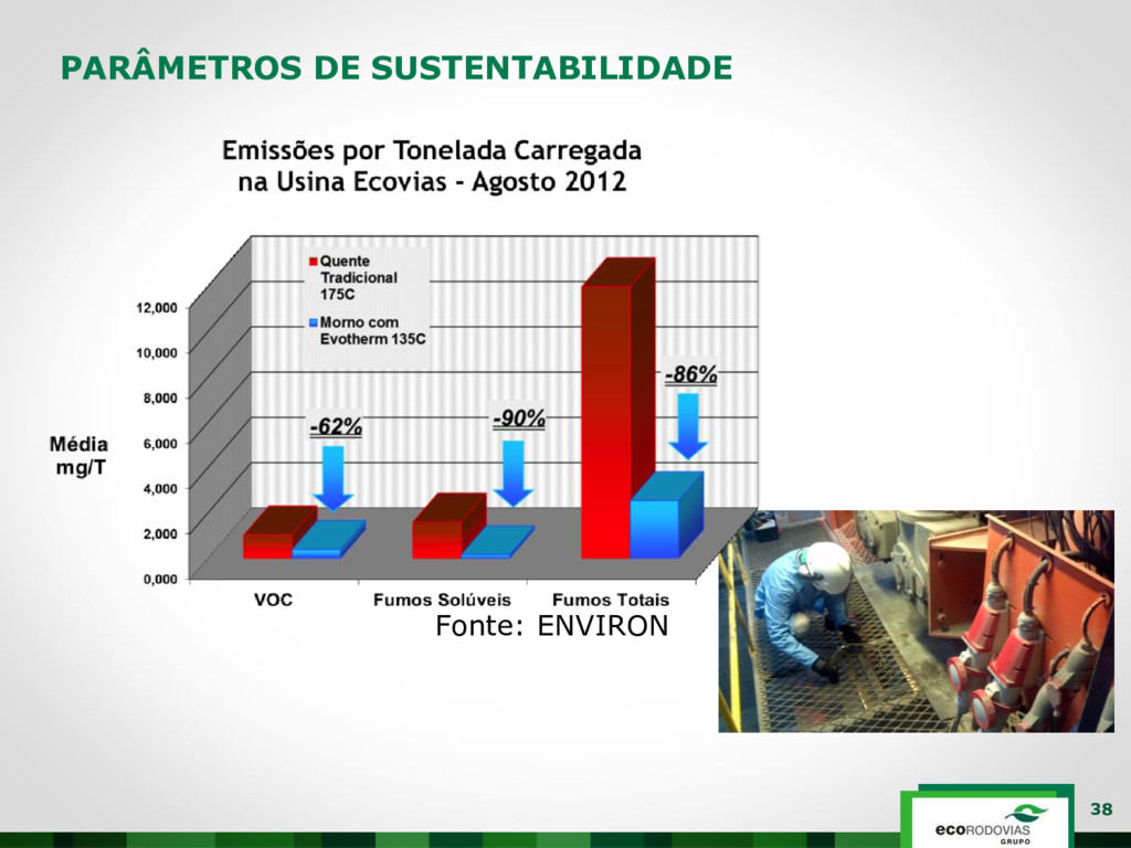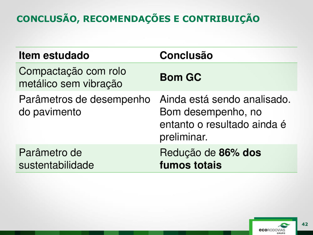 metálico sem vibração Bom GC Parâmetros de desempenho do pavimento Ainda está sendo analisado. Bom desempenho, no entanto o resultado ainda é preliminar. Parâmetro de sustentabilidade Redução de 86% dos fumos totais 42