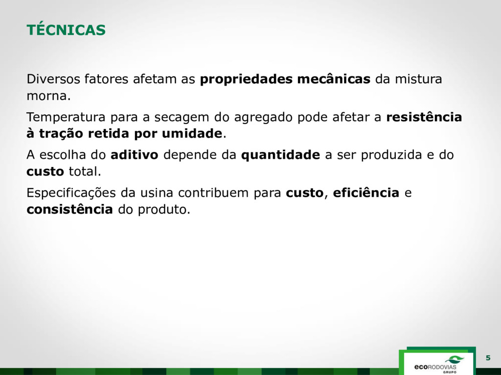 Temperatura para a secagem do agregado pode afetar a resistência à tração retida por umidade. A escolha do aditivo depende da quantidade a ser produzida e do custo total. Especificações da usina contribuem para custo, eficiência e consistência do produto. 5