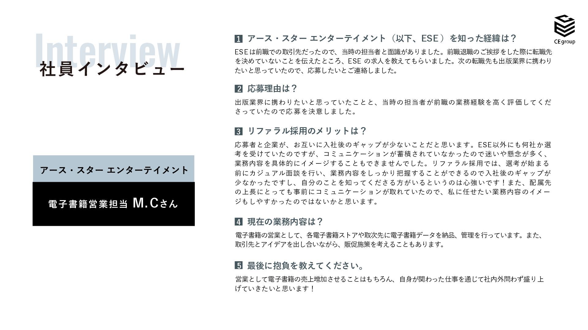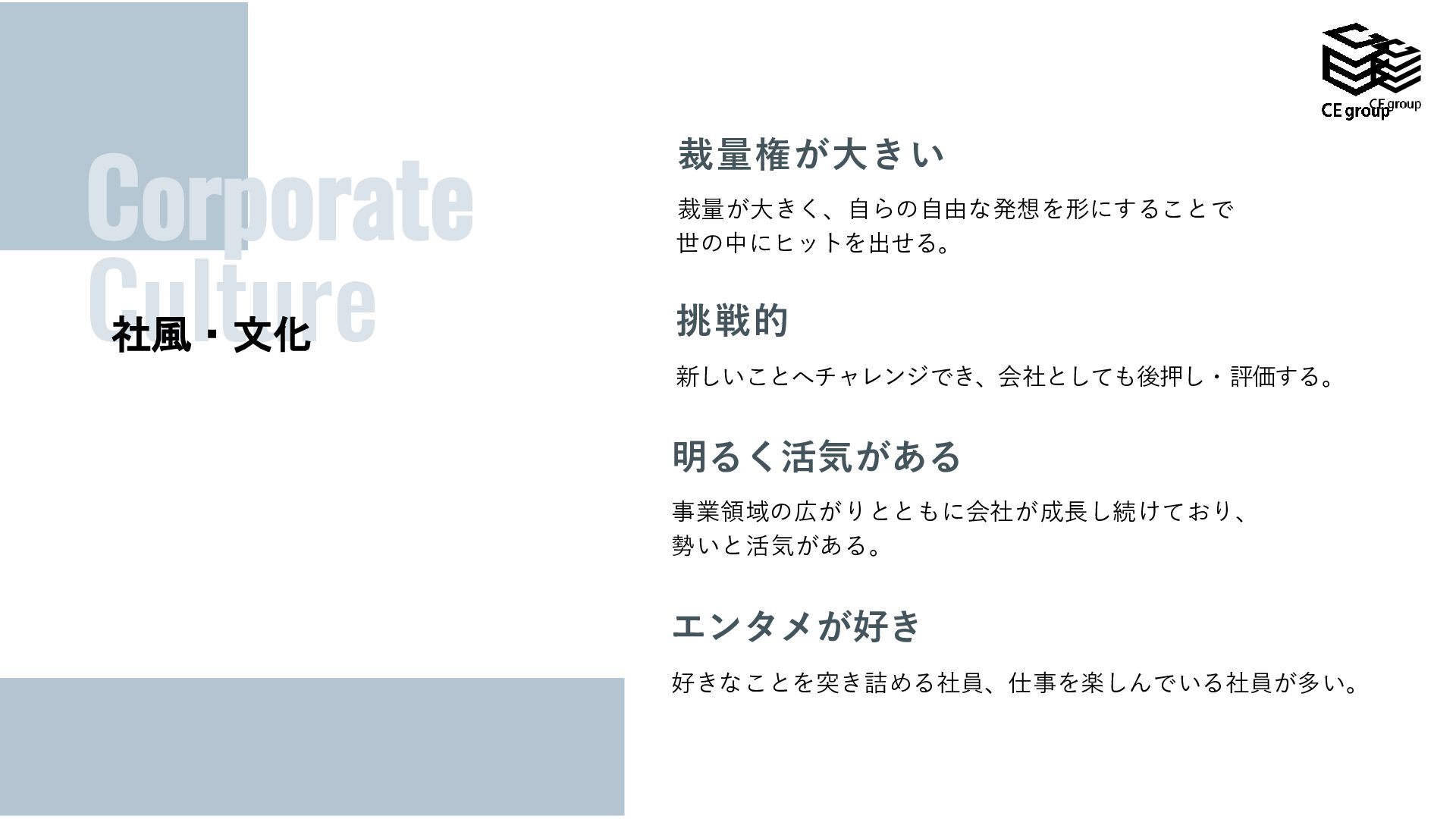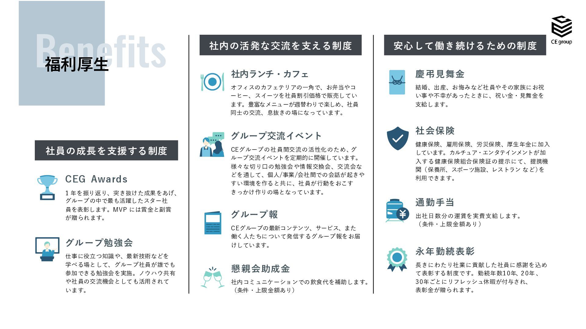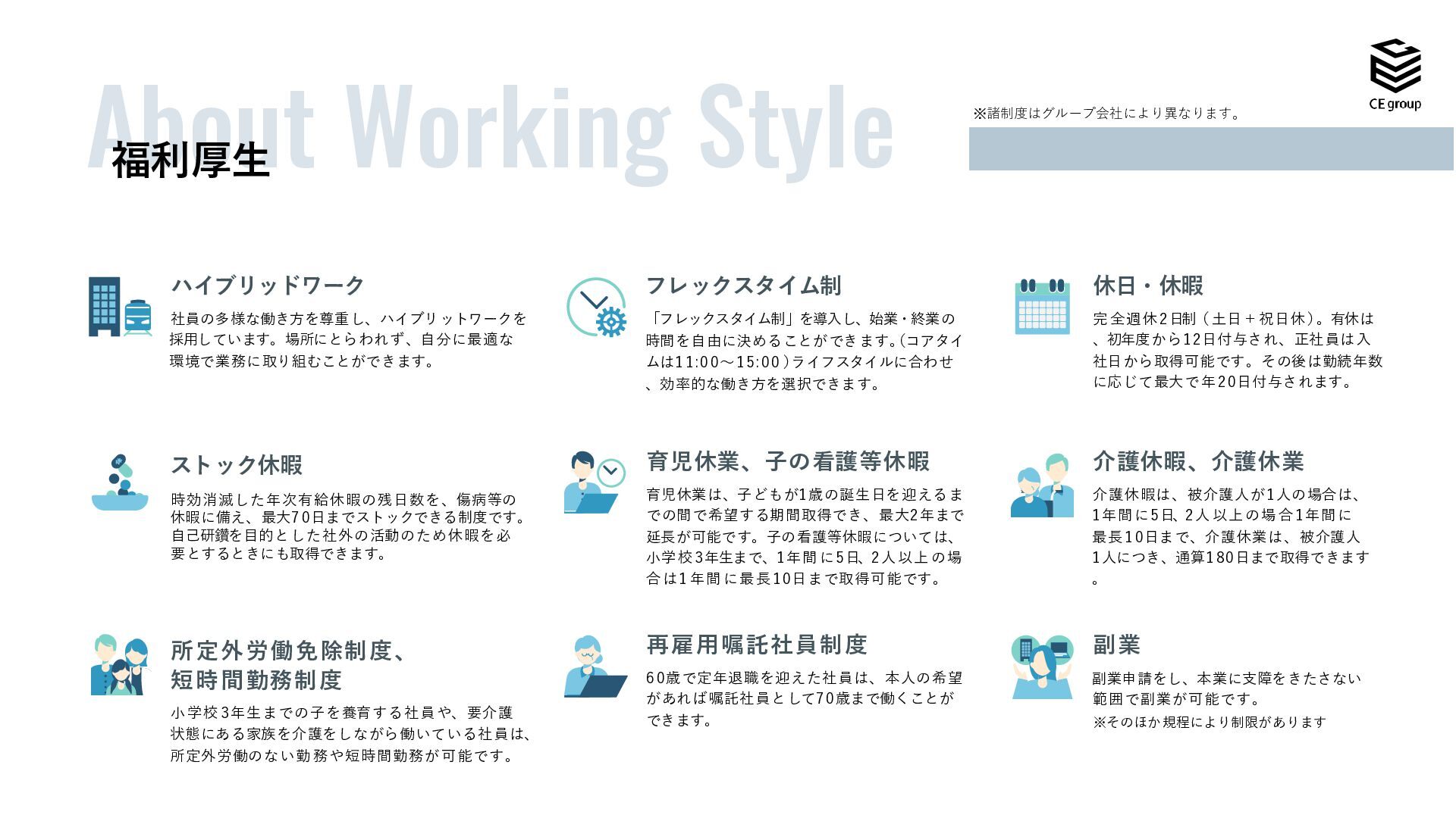 、効率的な働き方を選択できます。 休日・休暇 完全週休2日制(土日+祝日休) 。有休は 、初年度から12日付与され、正社員は入 社日から取得可能です。その後は勤続年数 に応じて最大で 年20日付与されます。 副業 副業申請をし、本業に支障をきたさない 範囲で副業が可能です。 ※そのほか規程により制限があります 再雇用嘱託社員制度 60歳で定年退職を迎えた社員は、本人の希望 があれば嘱託社員として70歳まで働くことが できます。 介護休暇、介護休業 介護休暇は、被介護人が1人の場合は、 1年間に5日、2人以上の場合1年間に 最長10日まで、介護休業は、被介護人 1人につき、通算180日まで取得できます 。 育児休業、子の看護等休暇 育児休業は、子どもが1歳の誕生日を迎えるま での間で希望する期間取得でき、最大2年まで 延長が可能です。子の看護等休暇については、 小学 校3年生まで、1年間 に5日、2人 以上 の場 合は1 年間 に最 長10日まで取得可能です。 ハイブリッドワーク 社員の多様な働き方を尊重し、ハイブリットワークを 採用しています。場所にとらわれず、自分に最適な 環境で業務に取り組むことができます。 ストック休暇 時効消滅した年次有給休暇の残日数を、傷病等の 休暇に備え、最大70日までストックできる制度です。 自己研鑽を目的とした社外の活動のため休暇を必 要とするときにも取得できます。 所定外労働免除制度、 短時間勤務制度 小 学校 3年生までの子を養育する社員や、要介護 状態にある家族を介護をしながら働いている社員は、 所定外労働のない勤 務や短時間勤務が 可能です。 ※諸制度はグループ会社により異なります。 福利厚生