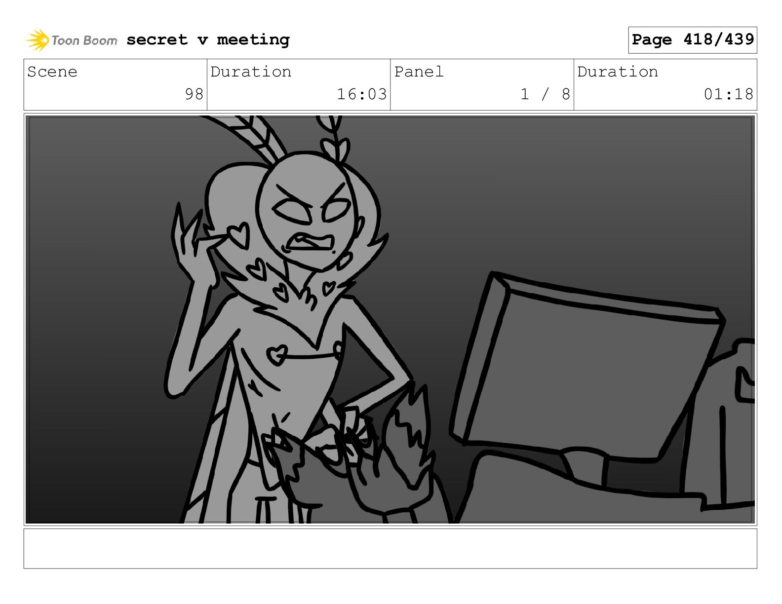 Scene 98 Duration 16:03 Panel 1 / 8 Duration 01:18