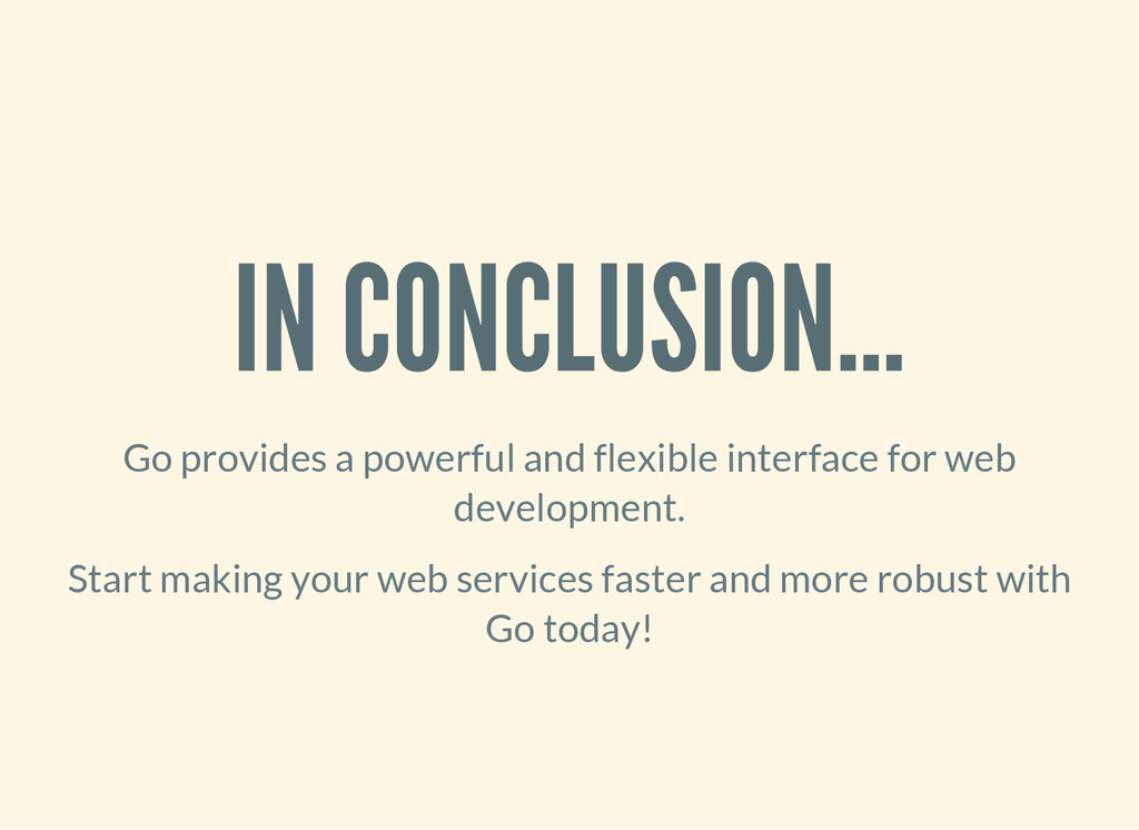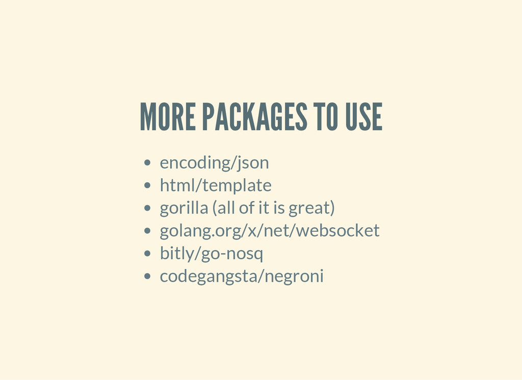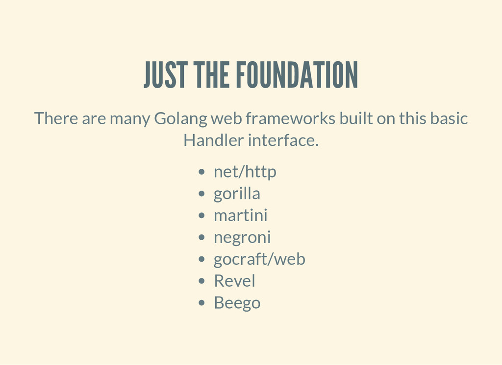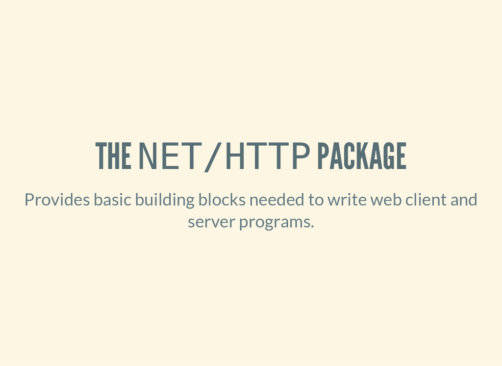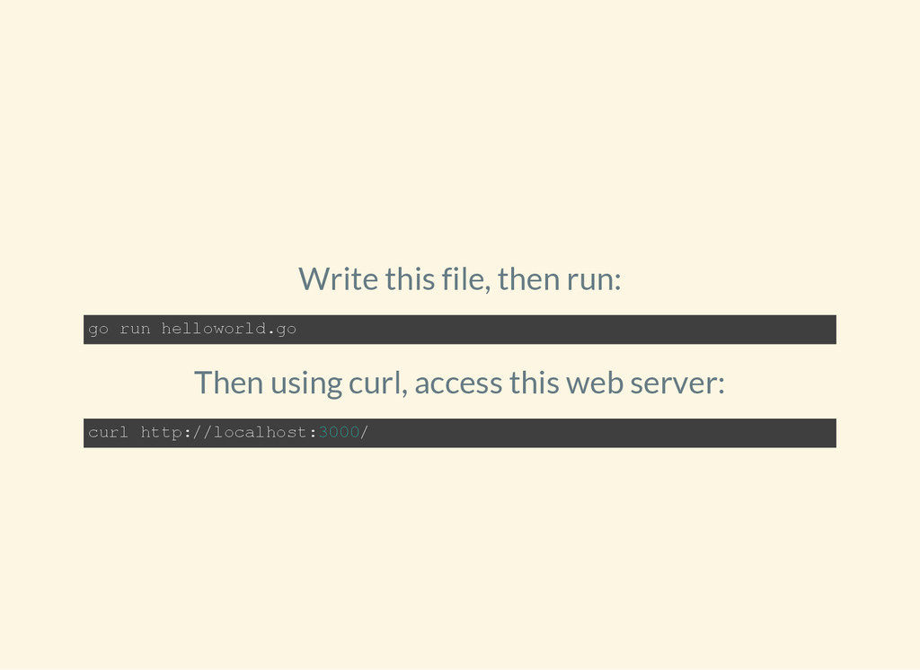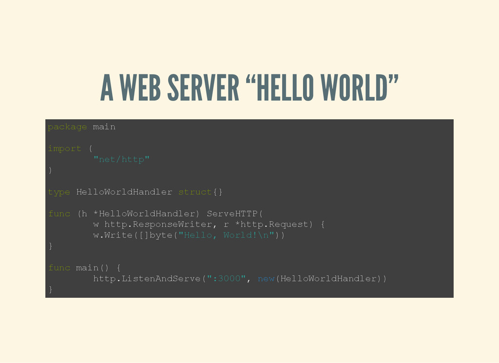 g e m a i n i m p o r t ( " n e t / h t t p " ) t y p e H e l l o W o r l d H a n d l e r s t r u c t { } f u n c ( h * H e l l o W o r l d H a n d l e r ) S e r v e H T T P ( w h t t p . R e s p o n s e W r i t e r , r * h t t p . R e q u e s t ) { w . W r i t e ( [ ] b y t e ( " H e l l o , W o r l d ! \ n " ) ) } f u n c m a i n ( ) { h t t p . L i s t e n A n d S e r v e ( " : 3 0 0 0 " , n e w ( H e l l o W o r l d H a n d l e r ) ) }