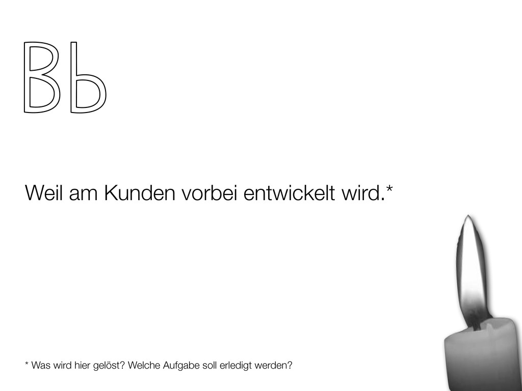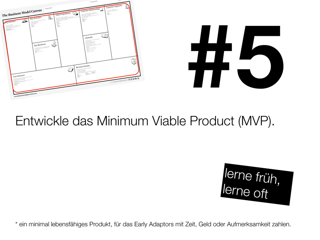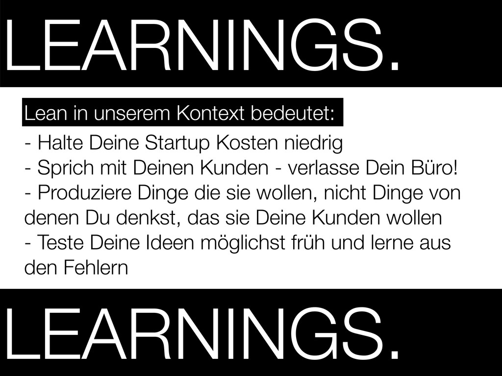 Kunden - verlasse Dein Büro! - Produziere Dinge die sie wollen, nicht Dinge von denen Du denkst, das sie Deine Kunden wollen - Teste Deine Ideen möglichst früh und lerne aus den Fehlern Lean in unserem Kontext bedeutet: LEARNINGS. LEARNINGS.