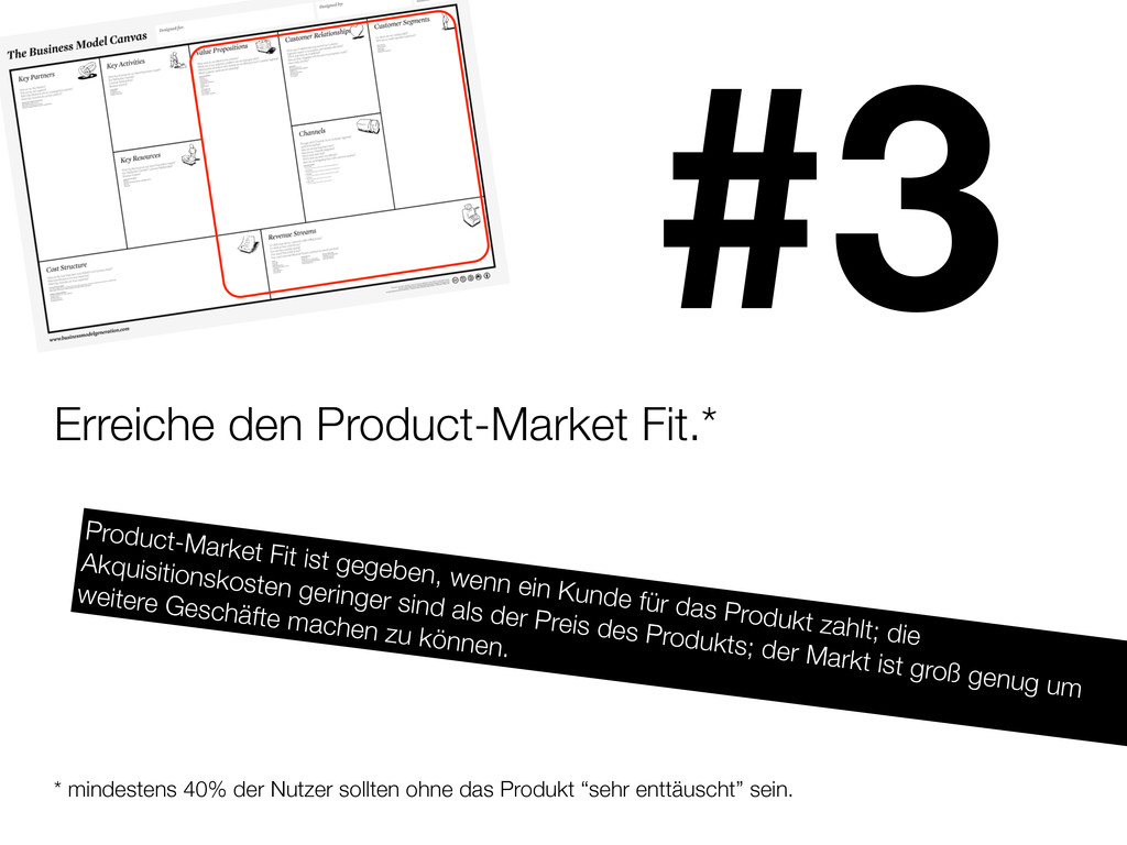 ohne das Produkt “sehr enttäuscht” sein. #3 Product-Market Fit ist gegeben, wenn ein Kunde für das Produkt zahlt; die Akquisitionskosten geringer sind als der Preis des Produkts; der Markt ist groß genug um weitere Geschäfte machen zu können.