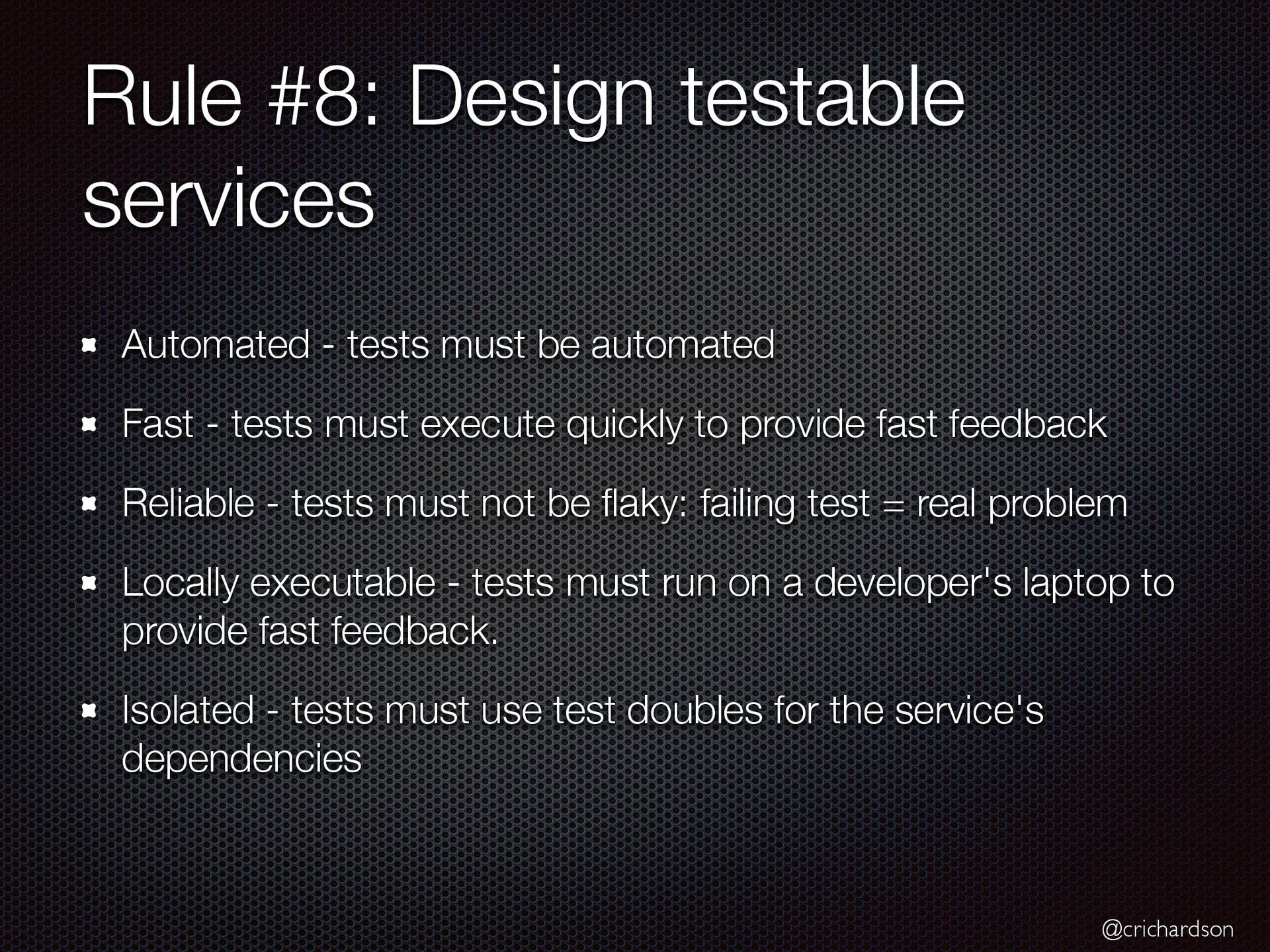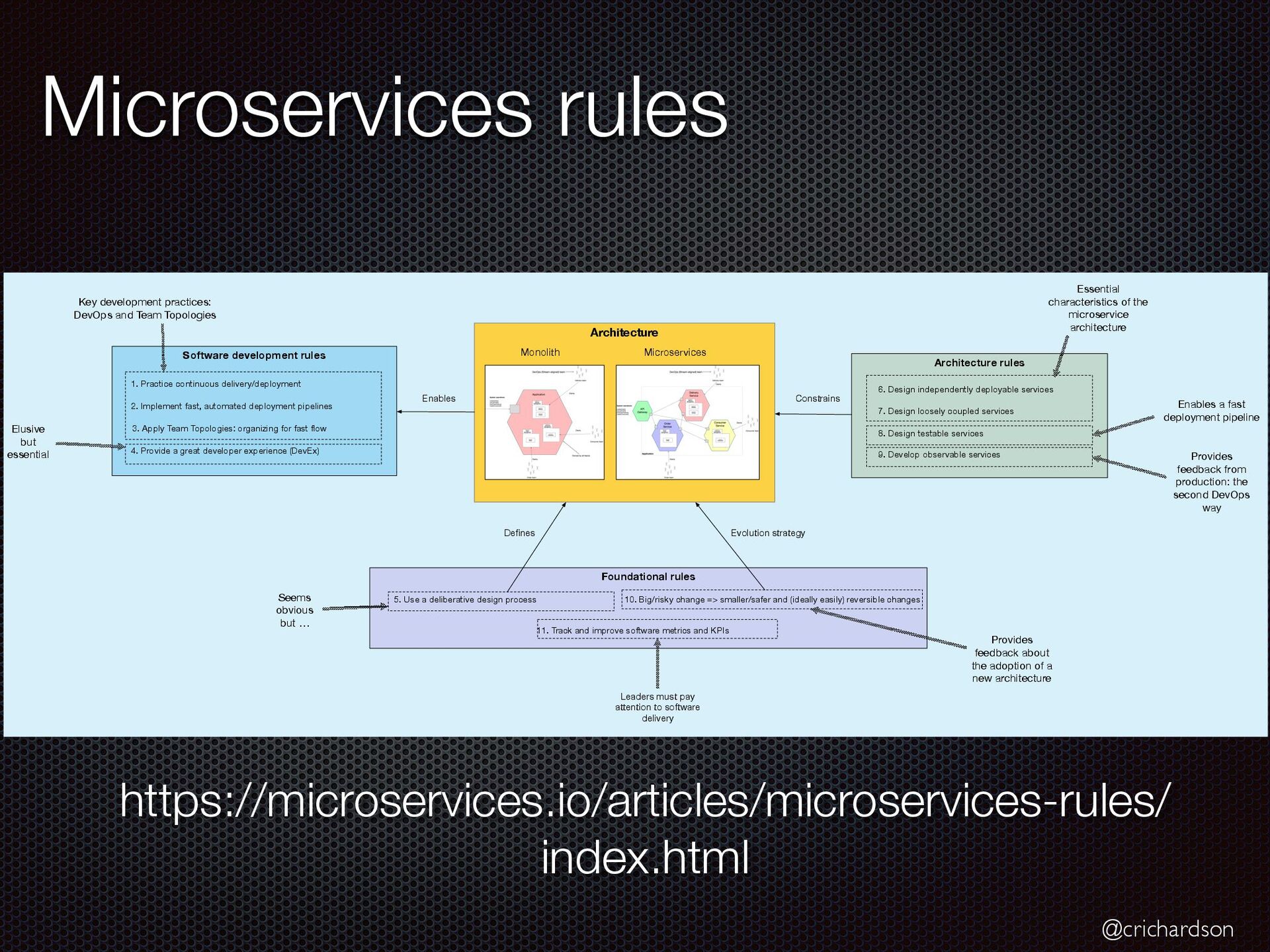 The microservice architecture has become increasingly popular over the past decade. Its key benefits include significantly improving the developer experience and accelerating software delivery. Sadly, however, microservices have often been widely misunderstood and used inappropriately. As a result, many organizations have struggled to benefit from their adoption. I’ve had numerous conversations where developers have complained that their new microservices-based applications are difficult to change. They have very quickly created an unmaintainable legacy application. To prevent this from happening, I’ve defined 11 development and architecture rules (a.k.a. best practices).