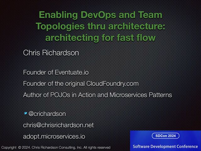 In this presentation, I describe the architectural requirements that enable DevOps and Team Topologies to deliver a fast flow of changes. You will learn about the forces that shape an architecture and the trade-offs that you will need to make when designing an architecture. I show how to decide between the monolithic and microservice architectural styles. You will learn key monolithic architecture patterns for fast flow. I describe how to design a microservice architecture.