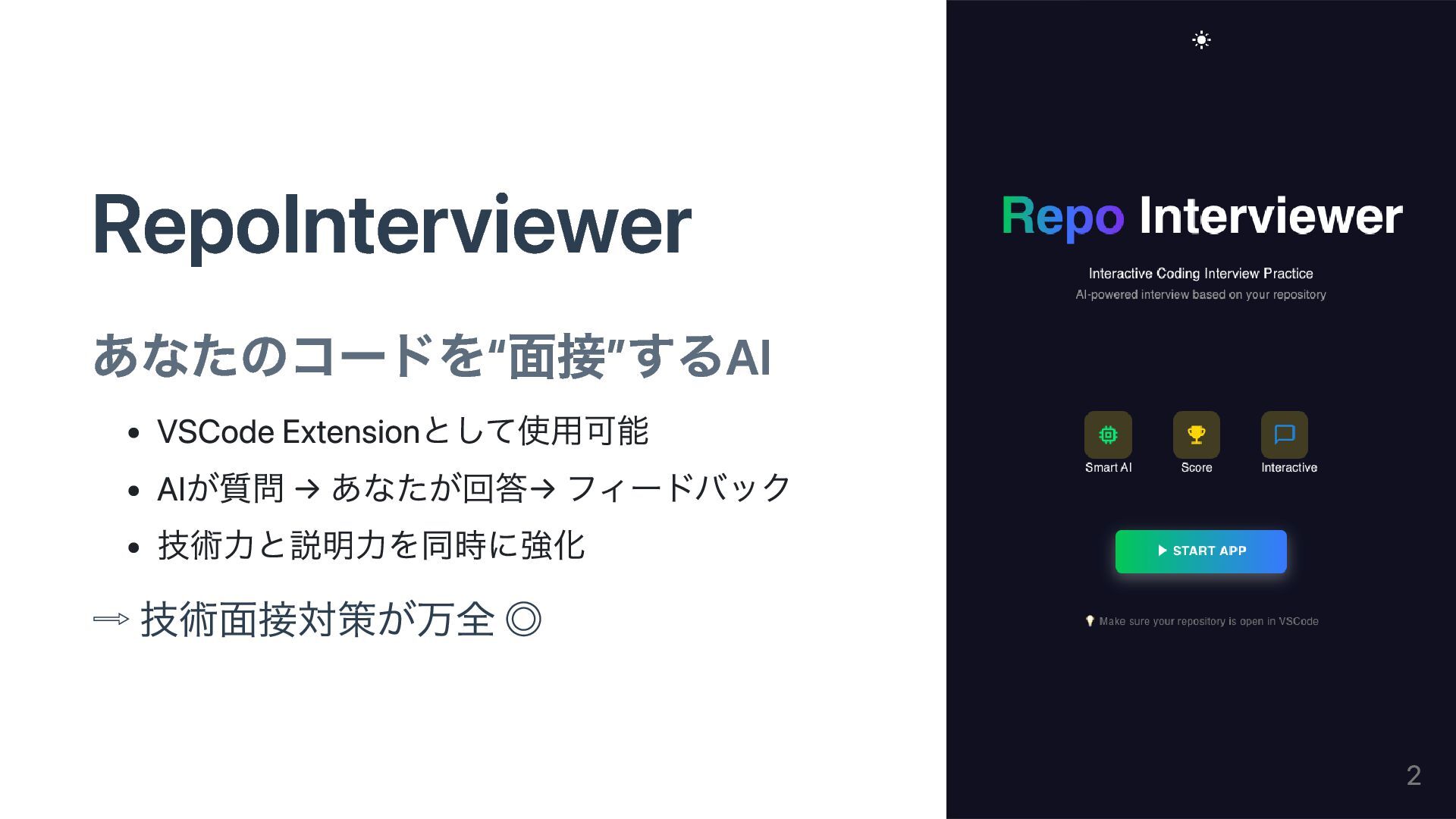 RepoInterviewer あなたのコードを“面接”するAI VSCode Extensionとして使用可能 AIが質問 → あなたが回答→ フィードバック 技術力と説明力を同時に強化 ⇨