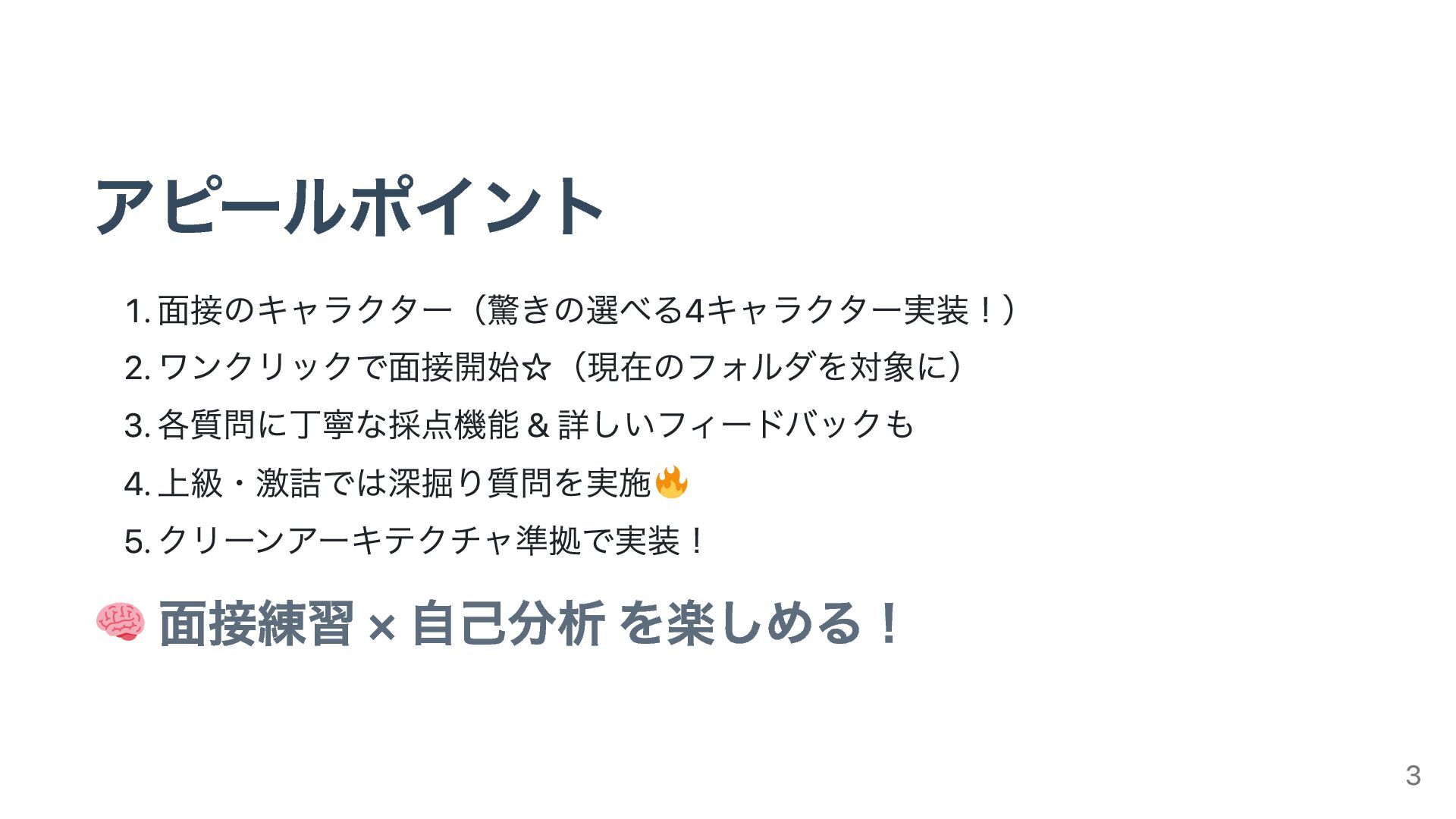 上級・激詰では深掘り質問を実施 5. クリーンアーキテクチャ準拠で実装! 面接練習 × 自己分析 を楽しめる! 3