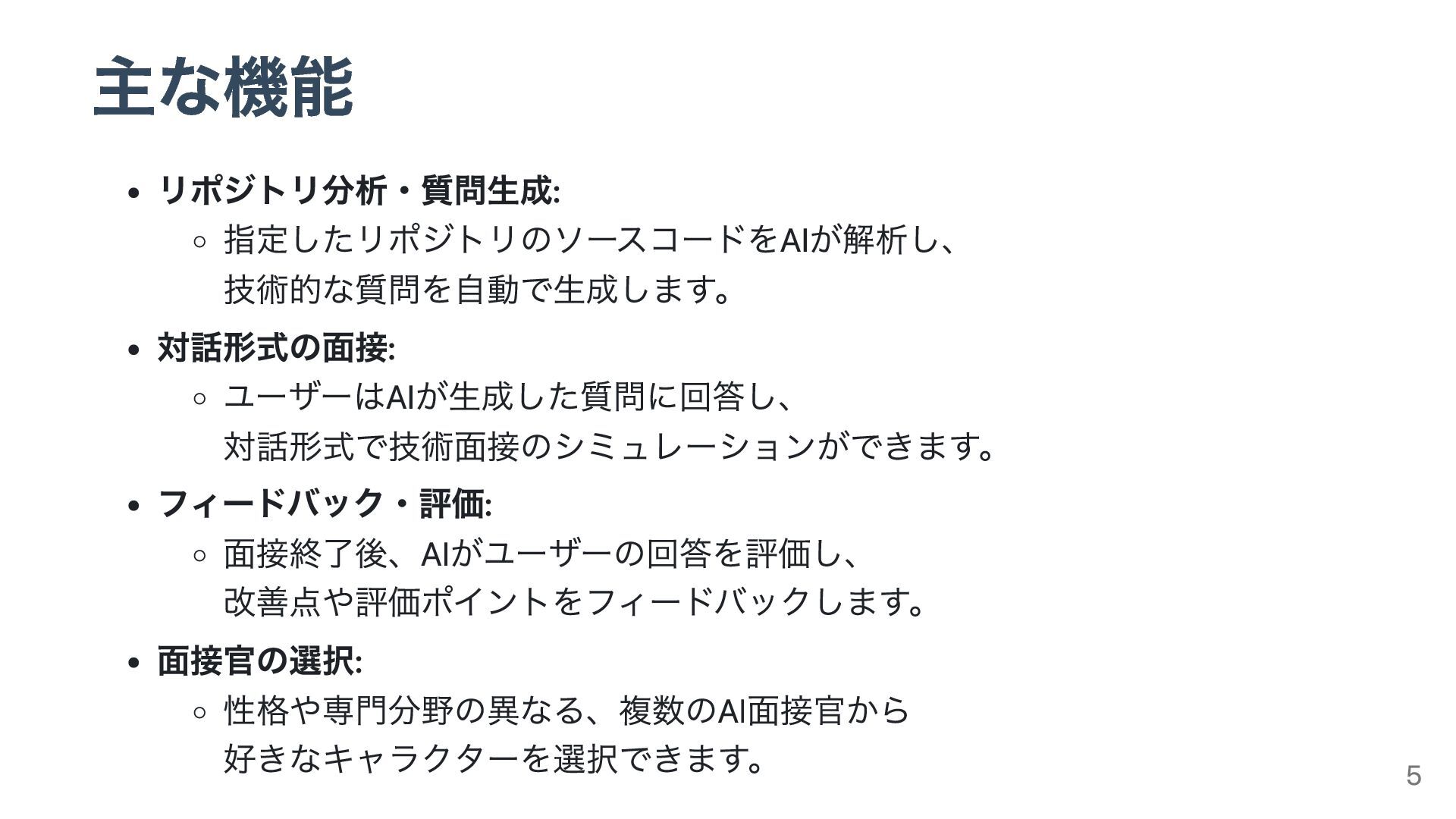 主な機能 リポジトリ分析・質問生成: 指定したリポジトリのソースコードをAIが解析し、 技術的な質問を自動で生成します。 対話形式の面接: ユーザーはAIが生成した質問に回答し、 対話形式で技術面接のシミュレーションができます。 フィードバック・評価: 面接終了後、AIがユーザーの回答を評価し、 改善点や評価ポイントをフィードバックします。