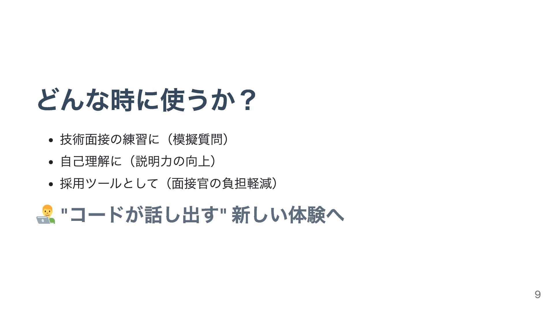 どんな時に使うか? 技術面接の練習に(模擬質問) 自己理解に(説明力の向上) 採用ツールとして(面接官の負担軽減) "コードが話し出す" 新しい体験へ 9