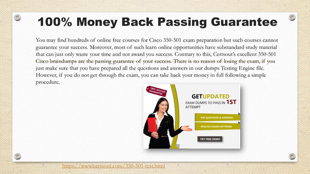 online free courses for Cisco 350-501 exam preparation but such courses cannot guarantee your success. Moreover, most of such learn online opportunities have substandard study material that can just only waste your time and not award you success. Contrary to this, Certsout’s excellent 350-501 Cisco braindumps are the passing guarantee of your success. There is no reason of losing the exam, if you just make sure that you have prepared all the questions and answers in our dumps Testing Engine file. However, if you do not get through the exam, you can take back your money in full following a simple procedure. https://www.certsout.com/350-501-test.html