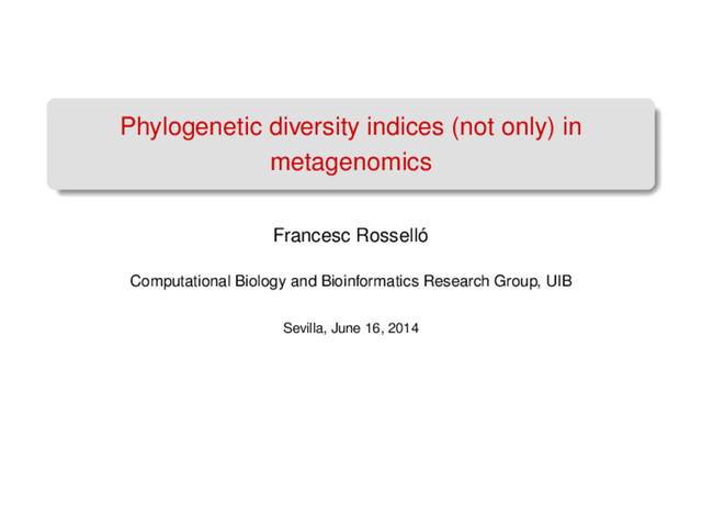 • Many indices measuring phylogenetic richness and homogeneity • Many indices measuring community composition differences • Several indices measuring community phylogenetic composition differences • I have skipped the spatial component of diversity • No one-size-fits-it-all index in any category • Metagenomics poses its own problems, due to the nature and amount of the data 40 / 40